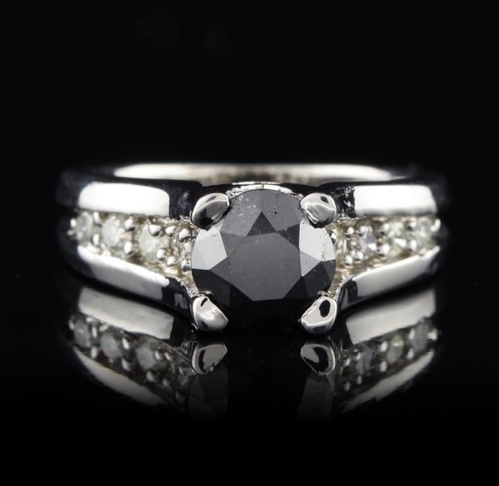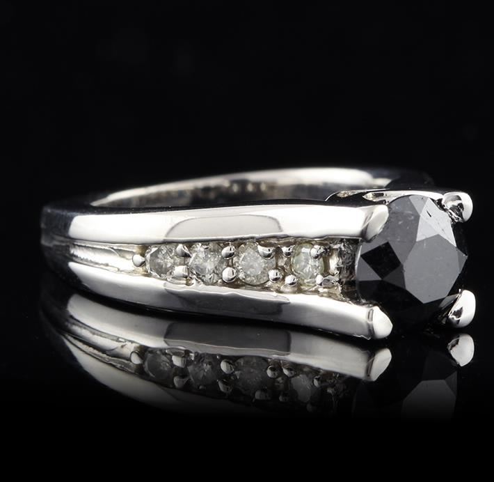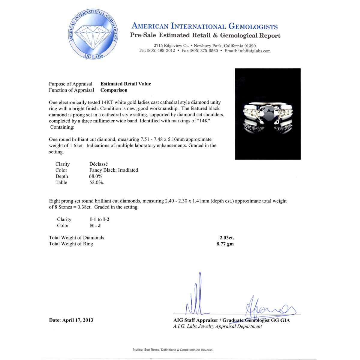 One electronically tested 14KT white gold ladies cast cathedral style diamond unity ring with a bright polish finish. Condition is new, good workmanship. The featured black diamond is prong set in a cathedral style setting, supported by diamond set shoulders, completed by a three millimeter wide band. Identified with markings of "14K". Containing: One round brilliant cut diamond, measuring 7.51 - 7.48 x 5.10mm approximate weight og 1.65ct. Indications of multiple laboratory enhancements. Graded in the setting. Clarity Declasse. Color Fancy Black; Irradiated. Depth 68.0%. Table 52.0%. Eight prong set round brilliant cut diamonds, measuring 2.40 - 2.30 x 1.41mm (depth est.) approximate total weight of 8 Stones = 0.38ct. Graded in the setting. Clarity I-1 to I-2. Color H - J. Total Weight of Diamonds 2.03ct. Total Weight of Ring 8.77 gm. AIG Appraised at $3,880.00.
