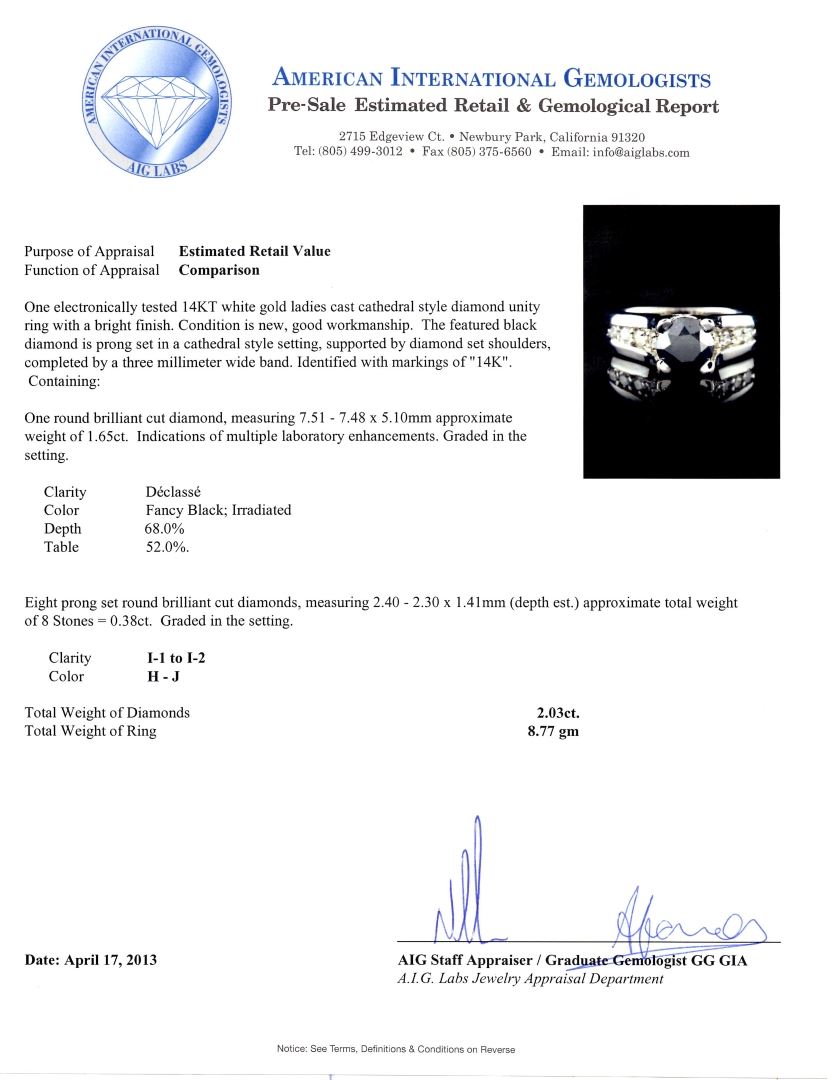 One electronically tested 14KT white gold ladies cast cathedral style diamond unity ring with a bright polish finish. Condition is new, good workmanship. The featured black diamond is prong set in a cathedral style setting, supported by diamond set shoulders, completed by a three millimeter wide band. Identified with markings of "14K". Containing: One round brilliant cut diamond, measuring 7.51 - 7.48 x 5.10mm approximate weight og 1.65ct. Indications of multiple laboratory enhancements. Graded in the setting. Clarity Declasse. Color Fancy Black; Irradiated. Depth 68.0%. Table 52.0%. Eight prong set round brilliant cut diamonds, measuring 2.40 - 2.30 x 1.41mm (depth est.) approximate total weight of 8 Stones = 0.38ct. Graded in the setting. Clarity I-1 to I-2. Color H - J. Total Weight of Diamonds 2.03ct. Total Weight of Ring 8.77 gm. AIG Appraised at $3,880.00.