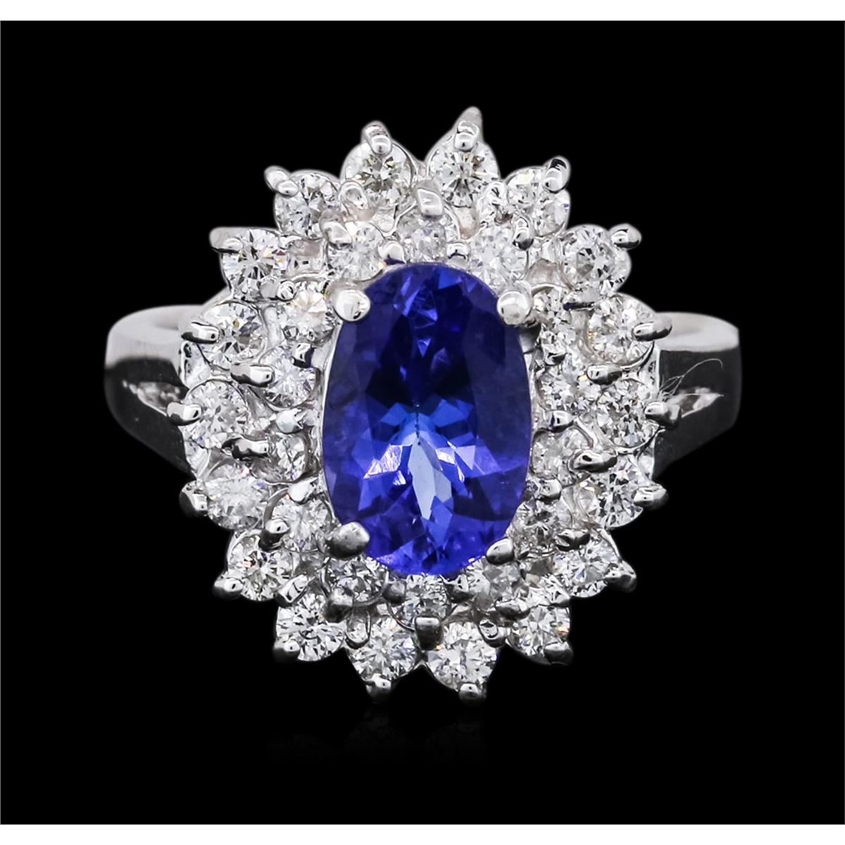 One electronically tested 14KT white gold ladies cast tanzanite & diamond ring with a bright finish. The featured tanzanite is set within a tiered diamond bezel, supported by a ribbed under gallery, completed by a three millimeter wide band. Identified with markings of "14K". Condition is new, good workmanship. Containing: One prong set oval brilliant cut natural tanzanite, measuring 9.00 x 6.00 x 4.38mm, approximate weight of 1.65ct., clarity is eye clean, type I, dark, slightly grayish, bluish violet color, (GIA bV 7/2), cut is good. Transmitting light with no distortion, transparent. Graded in the setting. Tanzanite is a very rare gemstone that is only found in the country of Tanzania. Originally discovered in 1967. Tiffany & Company, named the stone Tanzanite. It is found in the Usumburu Mountains that border the Umba Valley of northern Tanzania. Tanzanite occurs in gray, brown, violet, blue, reddish-purple, & green. The gem is interesting because of its exceptional pleochroism. Rotated in different directions a tanzanite will exhibit multiple changes of color. Tanzanite has a low tolerance to ultrasonic cleaning, and should not be cleaned using this method. Thirty-Two prong set round brilliant cut diamonds, measuring 2.00 - 1.70 x 1.11mm (depth est.) approximate total weight of 32 Stones = 0.76ct. Graded in the setting. Clarity: SI-2 to I-2. Color: H - I. Total Weight of Colored Stones 1.65ct. Total Weight of Diamonds 0.76ct. Total Weight of Ring 5.61 grams. AIG Appraised at $4,580.00.