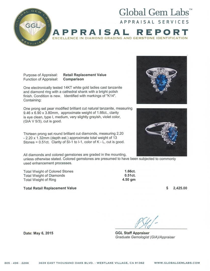 One electronically tested 14KT white gold ladies cast tanzanite and diamond ring with a cathedral shank with a bright polish finish. Identified with markings of "K14". Condition is new. Containing: One prong set pear modified brilliant cut natural tanzanite, measuring 9.46 x 6.90 x 3.80mm, approximate weight of 1.66ct., clarity is eye clean, type I, medium, very slightly grayish, violet color, (GIA V 5/3), cut is good. Thirteen prong set round brilliant cut diamonds, measuring 2.20 - 2.20 x 1.32mm (depth est.) approximate total weight of 13 Stones = 0.51ct. Clarity: SI-1 to I-1. Color: K - L, Cut is Good. All diamonds and colored gemstones are graded in the mounting, unless otherwise stated. Colored gemstones are presumed to have been subjected to commonly used enhancement processes.. Total Weight of Colored Stones 1.66ct. Total Weight of Diamonds 0.51ct. Total Weight of Ring 4.50 grams. GGL Appraised at $2,425.00.