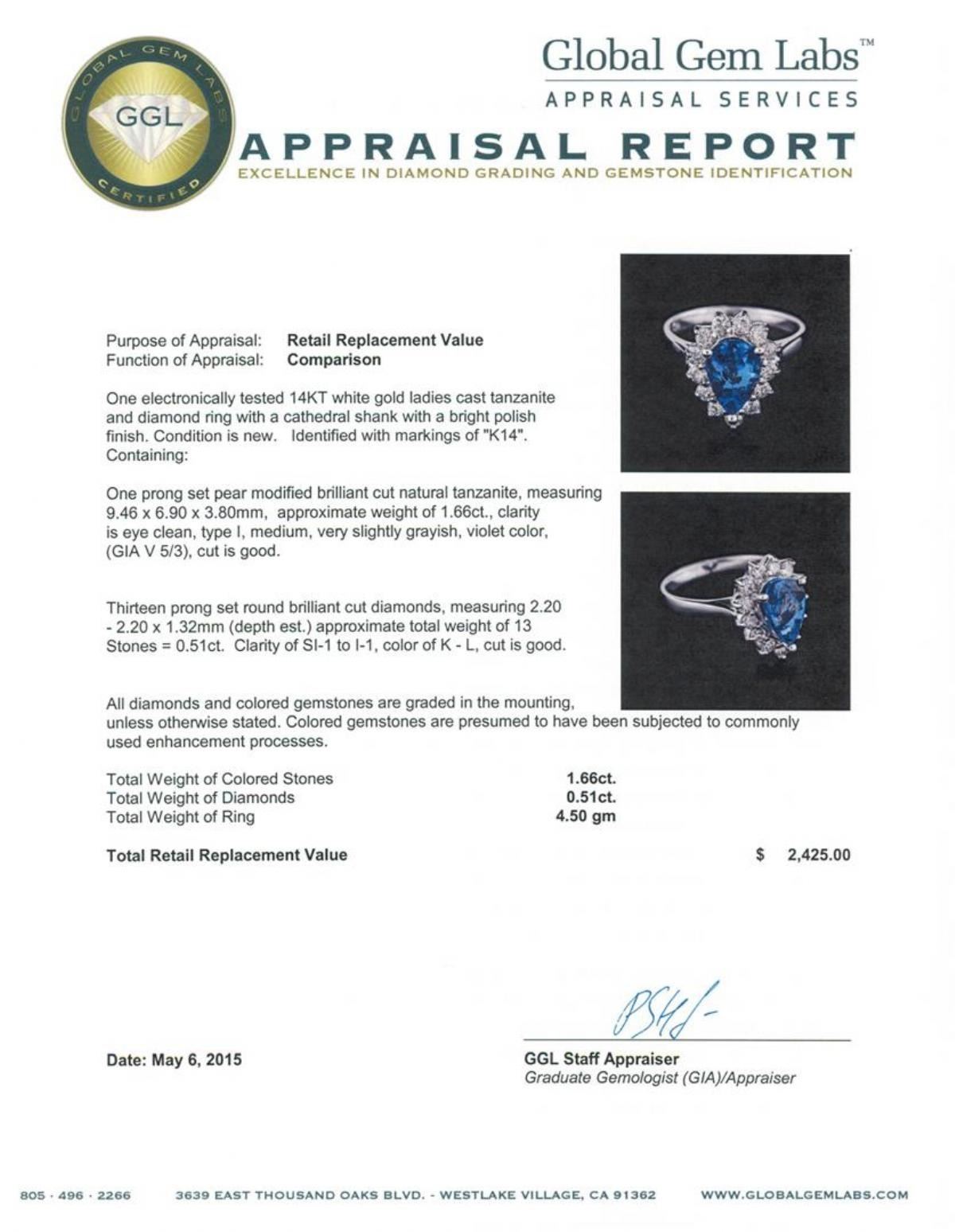 One electronically tested 14KT white gold ladies cast tanzanite and diamond ring with a cathedral shank with a bright polish finish. Identified with markings of "K14". Condition is new. Containing: One prong set pear modified brilliant cut natural tanzanite, measuring 9.46 x 6.90 x 3.80mm, approximate weight of 1.66ct., clarity is eye clean, type I, medium, very slightly grayish, violet color, (GIA V 5/3), cut is good. Thirteen prong set round brilliant cut diamonds, measuring 2.20 - 2.20 x 1.32mm (depth est.) approximate total weight of 13 Stones = 0.51ct. Clarity: SI-1 to I-1. Color: K - L, Cut is Good. All diamonds and colored gemstones are graded in the mounting, unless otherwise stated. Colored gemstones are presumed to have been subjected to commonly used enhancement processes.. Total Weight of Colored Stones 1.66ct. Total Weight of Diamonds 0.51ct. Total Weight of Ring 4.50 grams. GGL Appraised.