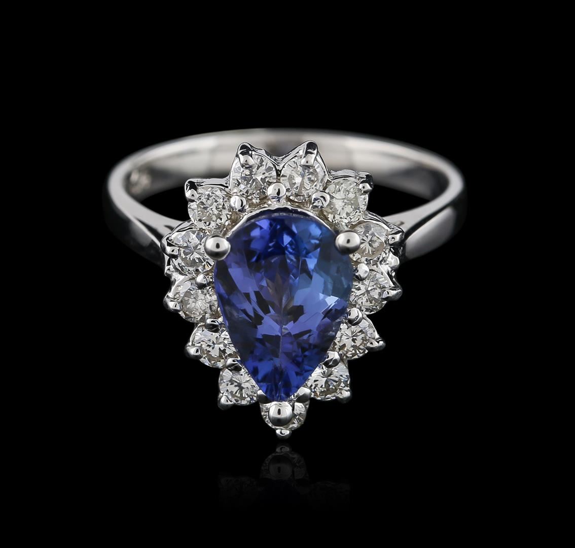 One electronically tested 14KT white gold ladies cast tanzanite and diamond ring with a cathedral shank with a bright polish finish. Identified with markings of "K14". Condition is new. Containing: One prong set pear modified brilliant cut natural tanzanite, measuring 9.46 x 6.90 x 3.80mm, approximate weight of 1.66ct., clarity is eye clean, type I, medium, very slightly grayish, violet color, (GIA V 5/3), cut is good. Thirteen prong set round brilliant cut diamonds, measuring 2.20 - 2.20 x 1.32mm (depth est.) approximate total weight of 13 Stones = 0.51ct. Clarity: SI-1 to I-1. Color: K - L, Cut is Good. All diamonds and colored gemstones are graded in the mounting, unless otherwise stated. Colored gemstones are presumed to have been subjected to commonly used enhancement processes.. Total Weight of Colored Stones 1.66ct. Total Weight of Diamonds 0.51ct. Total Weight of Ring 4.50 grams. GGL Appraised at $2,425.00.