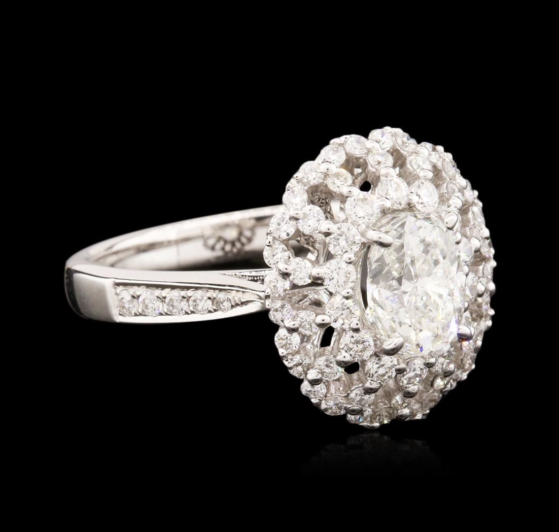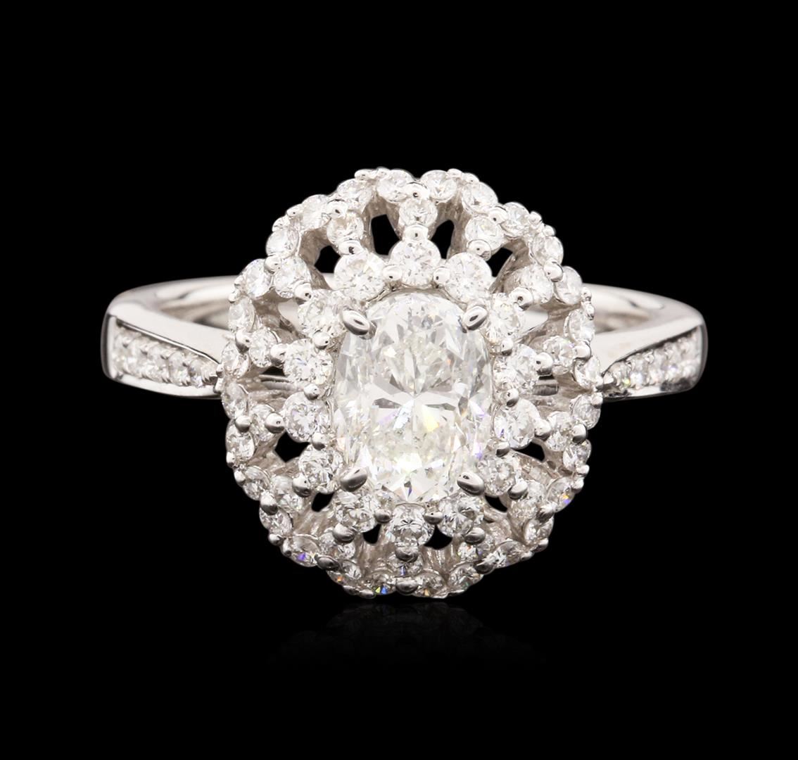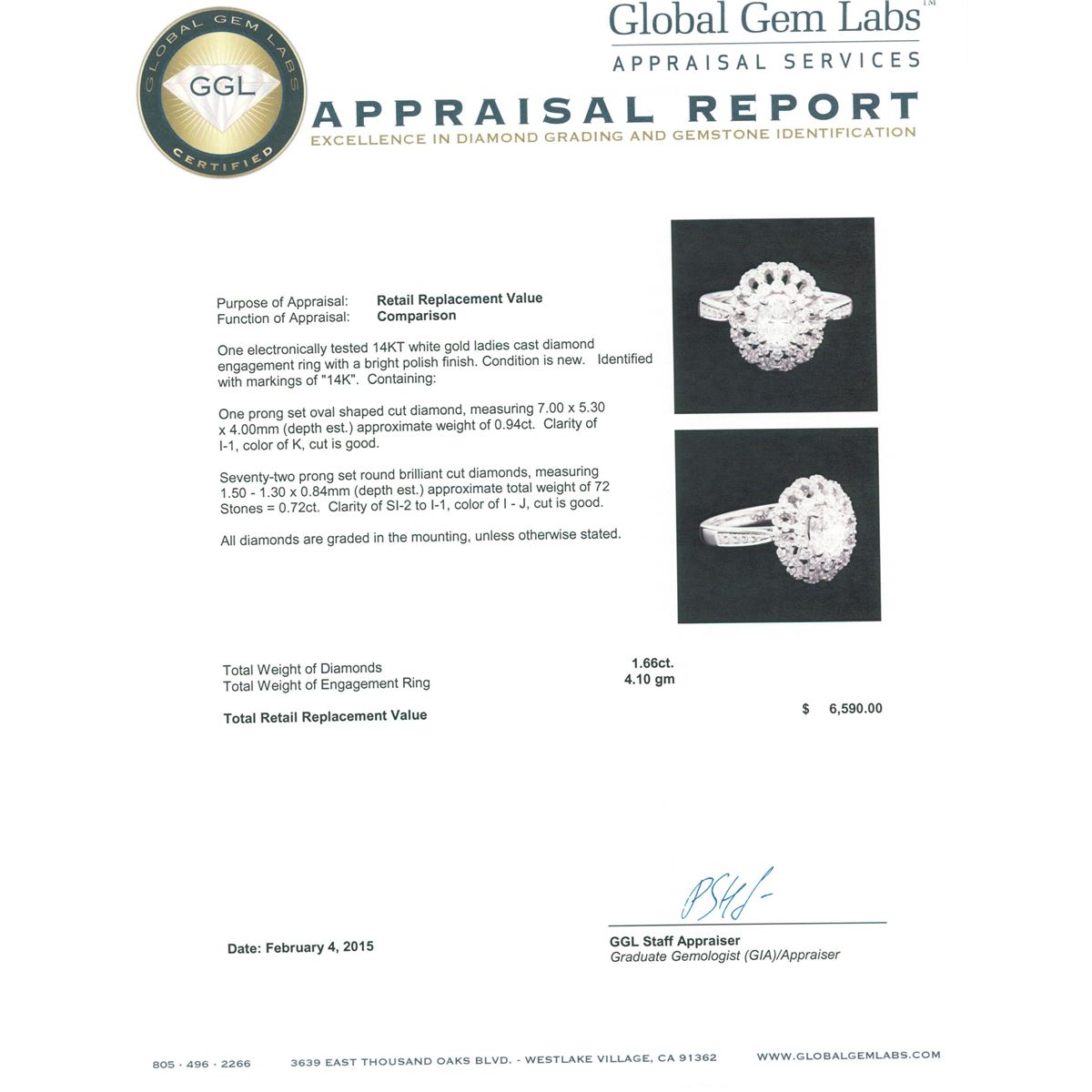 One electronically tested 14KT white gold ladies cast diamond engagement ring with a bright polish finish. Identified with markings of "14K". Condition is new. Containing: One prong set oval shaped cut diamond, measuring 7.00 x 5.30 x 4.00mm (depth est.) approximate weight of 0.94ct. Clarity: I-1. Color: K, Cut is Good. Seventy-Two prong set round brilliant cut diamonds, measuring 1.50 - 1.30 x 0.84mm (depth est.) approximate total weight of 72 Stones = 0.72ct. Clarity: SI-2 to I-1. Color: I - J, Cut is Good. All diamonds are graded in the mounting, unless otherwise stated. Total Weight of Diamonds 1.66ct. Total Weight of Engagement Ring 4.10 grams. GGL Appraised at $6,590.00.