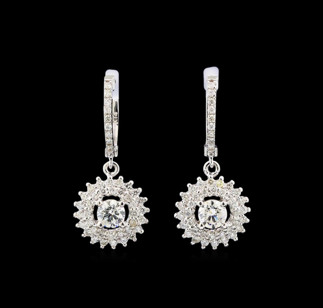 One pair electronically tested 14KT white gold ladies cast diamond earrings with hinged clip backs with a bright polish finish. Identified with markings of "14K". Condition is new. Containing: Two prong set round brilliant cut diamonds, measuring 4.90 - 4.90 x 2.94mm (depth est.) approximate total weight of 2 Stones = 0.86ct. Clarity: SI-1 to SI-2. Color: J, Cut is Good. Ninety prong set round brilliant cut diamonds, measuring 1.50 - 1.20 x 0.81mm (depth est.) approximate total weight of 90 Stones = 0.81ct. Clarity: SI-2 to I-2. Color: H - I, Cut is Good. All diamonds are graded in the mounting, unless otherwise stated. Total Weight of Diamonds 1.67ct. Total Weight of Earrings 5.40 grams. GGL Appraised at $5,365.00.