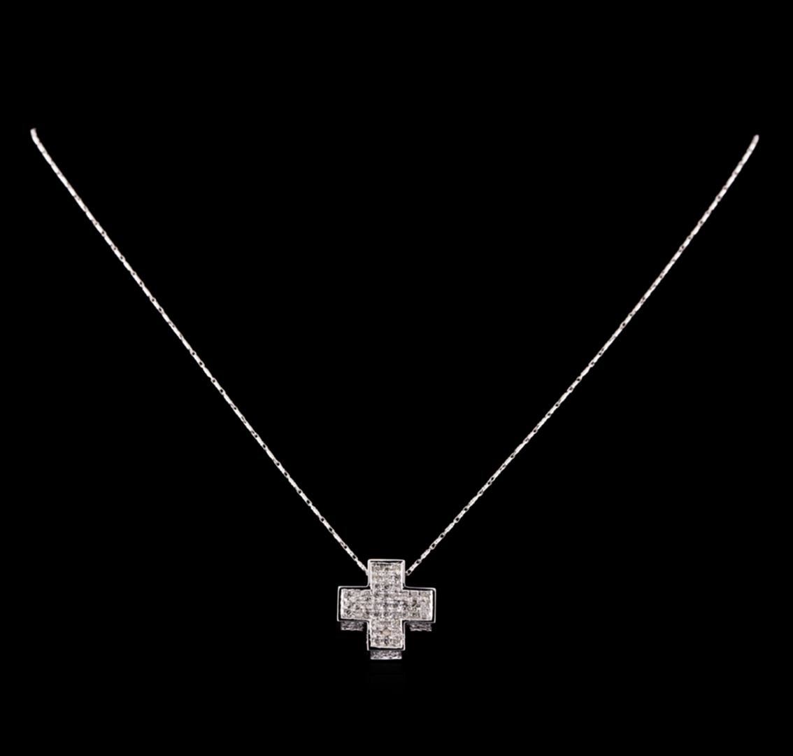 One electronically tested 14KT white gold ladies combination cast & assembled cross pendant & chain 18.0" long, medium fancy link with a lobster claw clasp with a bright polish finish. Identified with markings of "14K". Condition is new. Containing: Ninety-Three prong set round brilliant cut diamonds, measuring 1.80 - 1.60 x 1.02mm (depth est.) approximate total weight of 93 Stones = 1.67ct. Clarity: SI-1 to SI-2. Color: I - J, Cut is Good. All diamonds are graded in the mounting, unless otherwise stated. Total Weight of Diamonds 1.67ct. Total Weight of Pendant & Chain 8.30 grams. GGL Appraised.