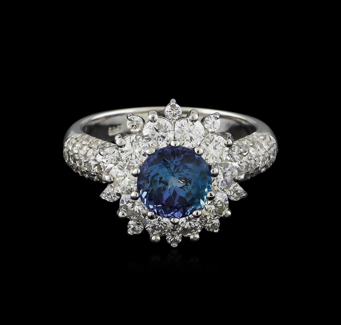 One electronically tested 14KT white gold ladies combination cast & assembled ring with a bright polish finish. Identified with markings of "585". Condition is new. Containing: One prong set round modified brilliant cut natural tanzanite, measuring 7.28 - 7.21 x 4.71 mm, approximate weight of 1.67ct., clarity is eye clean, type I, medium dark, very slightly grayish, violet color, (GIA V 6/3), cut is good. Sixty-Two prong set round brilliant cut diamonds, measuring 1.30 - 1.30 x 0.78mm (depth est.) approximate total weight of 62 Stones = 0.50 ct. Clarity: SI-2 to I-1. Color: I - J, Cut is Good. Ten prong set round brilliant cut diamonds, measuring 2.80 - 2.80 x 1.68mm (depth est.) approximate total weight of 10 Stones = 0.80 ct. Clarity: I-1. Color: J, Cut is Good. Colored gemstones are presumed to have been subjected to commonly used enhancement processes. All diamonds and colored gemstones are graded in the mounting, unless otherwise stated. Total Weight of Colored Stones 1.67ct. Total Weight of Diamonds 1.30 ct. Total Weight of Ring 5.50 grams. GGL Appraised.