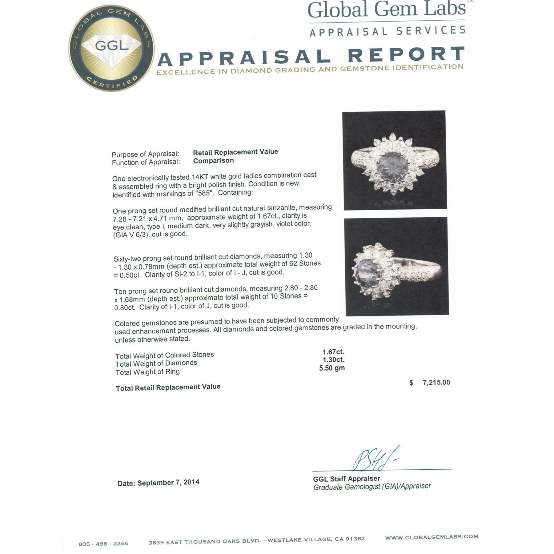 One electronically tested 14KT white gold ladies combination cast & assembled ring with a bright polish finish. Identified with markings of "585". Condition is new. Containing: One prong set round modified brilliant cut natural tanzanite, measuring 7.28 - 7.21 x 4.71 mm, approximate weight of 1.67ct., clarity is eye clean, type I, medium dark, very slightly grayish, violet color, (GIA V 6/3), cut is good. Sixty-Two prong set round brilliant cut diamonds, measuring 1.30 - 1.30 x 0.78mm (depth est.) approximate total weight of 62 Stones = 0.50 ct. Clarity: SI-2 to I-1. Color: I - J, Cut is Good. Ten prong set round brilliant cut diamonds, measuring 2.80 - 2.80 x 1.68mm (depth est.) approximate total weight of 10 Stones = 0.80 ct. Clarity: I-1. Color: J, Cut is Good. Colored gemstones are presumed to have been subjected to commonly used enhancement processes. All diamonds and colored gemstones are graded in the mounting, unless otherwise stated. Total Weight of Colored Stones 1.67ct. Total Weight of Diamonds 1.30 ct. Total Weight of Ring 5.50 grams. GGL Appraised.