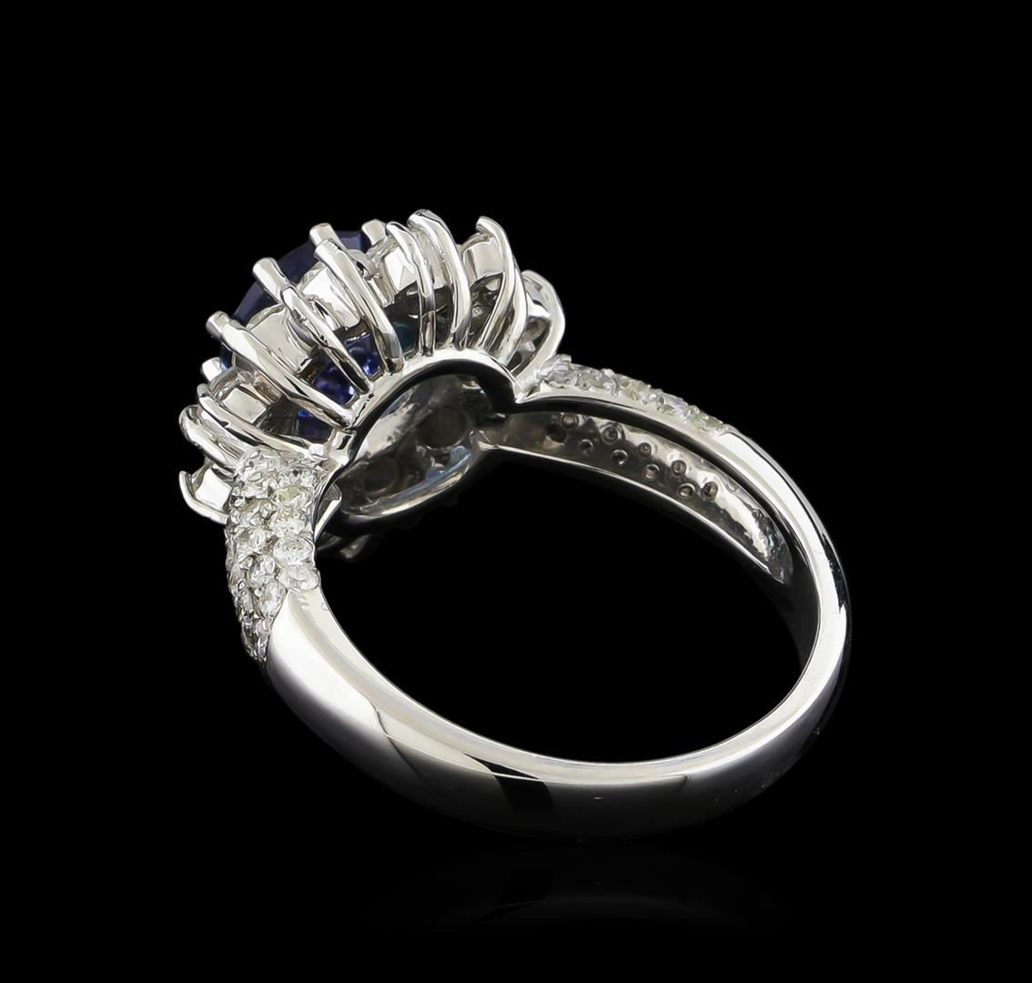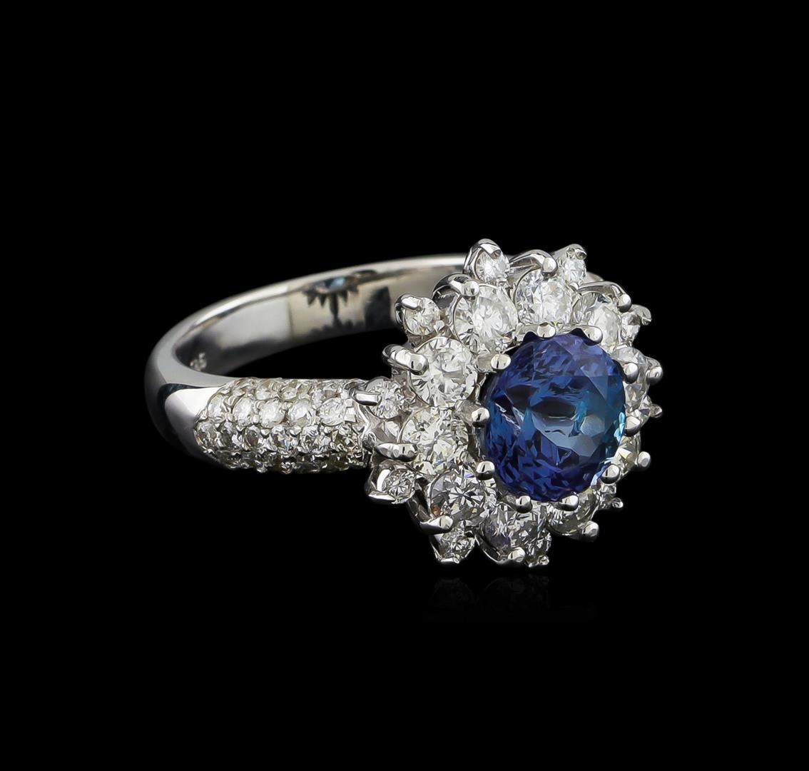 One electronically tested 14KT white gold ladies combination cast & assembled ring with a bright polish finish. Identified with markings of "585". Condition is new. Containing: One prong set round modified brilliant cut natural tanzanite, measuring 7.28 - 7.21 x 4.71 mm, approximate weight of 1.67ct., clarity is eye clean, type I, medium dark, very slightly grayish, violet color, (GIA V 6/3), cut is good. Sixty-Two prong set round brilliant cut diamonds, measuring 1.30 - 1.30 x 0.78mm (depth est.) approximate total weight of 62 Stones = 0.50 ct. Clarity: SI-2 to I-1. Color: I - J, Cut is Good. Ten prong set round brilliant cut diamonds, measuring 2.80 - 2.80 x 1.68mm (depth est.) approximate total weight of 10 Stones = 0.80 ct. Clarity: I-1. Color: J, Cut is Good. Colored gemstones are presumed to have been subjected to commonly used enhancement processes. All diamonds and colored gemstones are graded in the mounting, unless otherwise stated. Total Weight of Colored Stones 1.67ct. Total Weight of Diamonds 1.30 ct. Total Weight of Ring 5.50 grams. GGL Appraised.