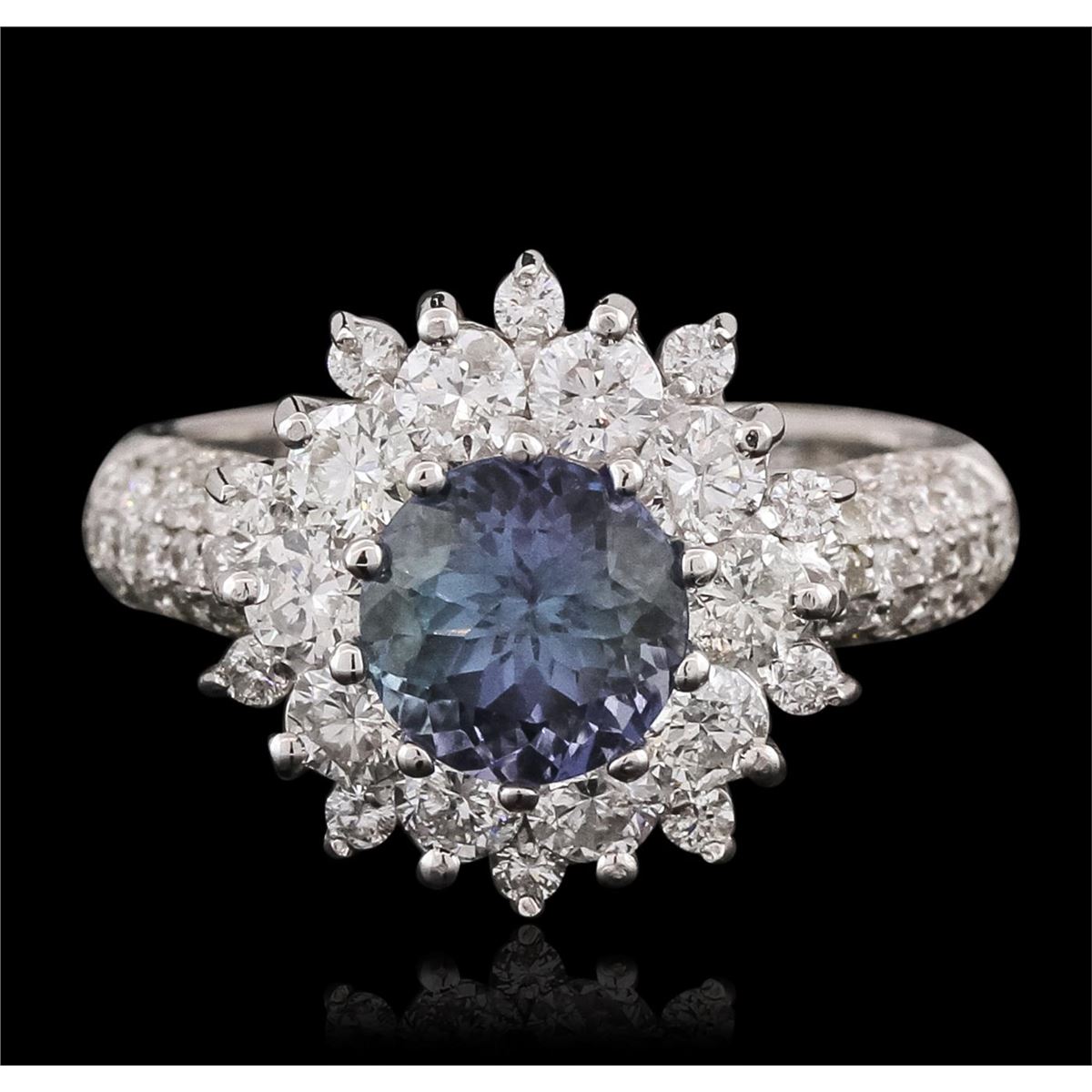 One electronically tested 14KT white gold ladies combination cast & assembled ring with a bright polish finish. Identified with markings of "585". Condition is new. Containing: One prong set round modified brilliant cut natural tanzanite, measuring 7.28 - 7.21 x 4.71 mm, approximate weight of 1.67ct., clarity is eye clean, type I, medium dark, very slightly grayish, violet color, (GIA V 6/3), cut is good. Sixty-Two prong set round brilliant cut diamonds, measuring 1.30 - 1.30 x 0.78mm (depth est.) approximate total weight of 62 Stones = 0.50ct. Clarity: SI-2 to I-1. Color: I - J, Cut is Good. Ten prong set round brilliant cut diamonds, measuring 2.80 - 2.80 x 1.68mm (depth est.) approximate total weight of 10 Stones = 0.80ct. Clarity: I-1. Color: J, Cut is Good. Colored gemstones are presumed to have been subjected to commonly used enhancement processes. All diamonds and colored gemstones are graded in the mounting, unless otherwise stated. Total Weight of Colored Stones 1.67ct. Total Weight of Diamonds 1.30ct. Total Weight of Ring 5.50 grams. GGL Appraised at $7,215.00.