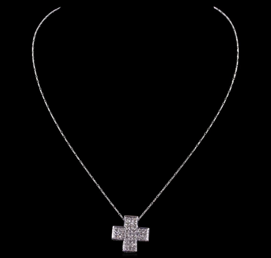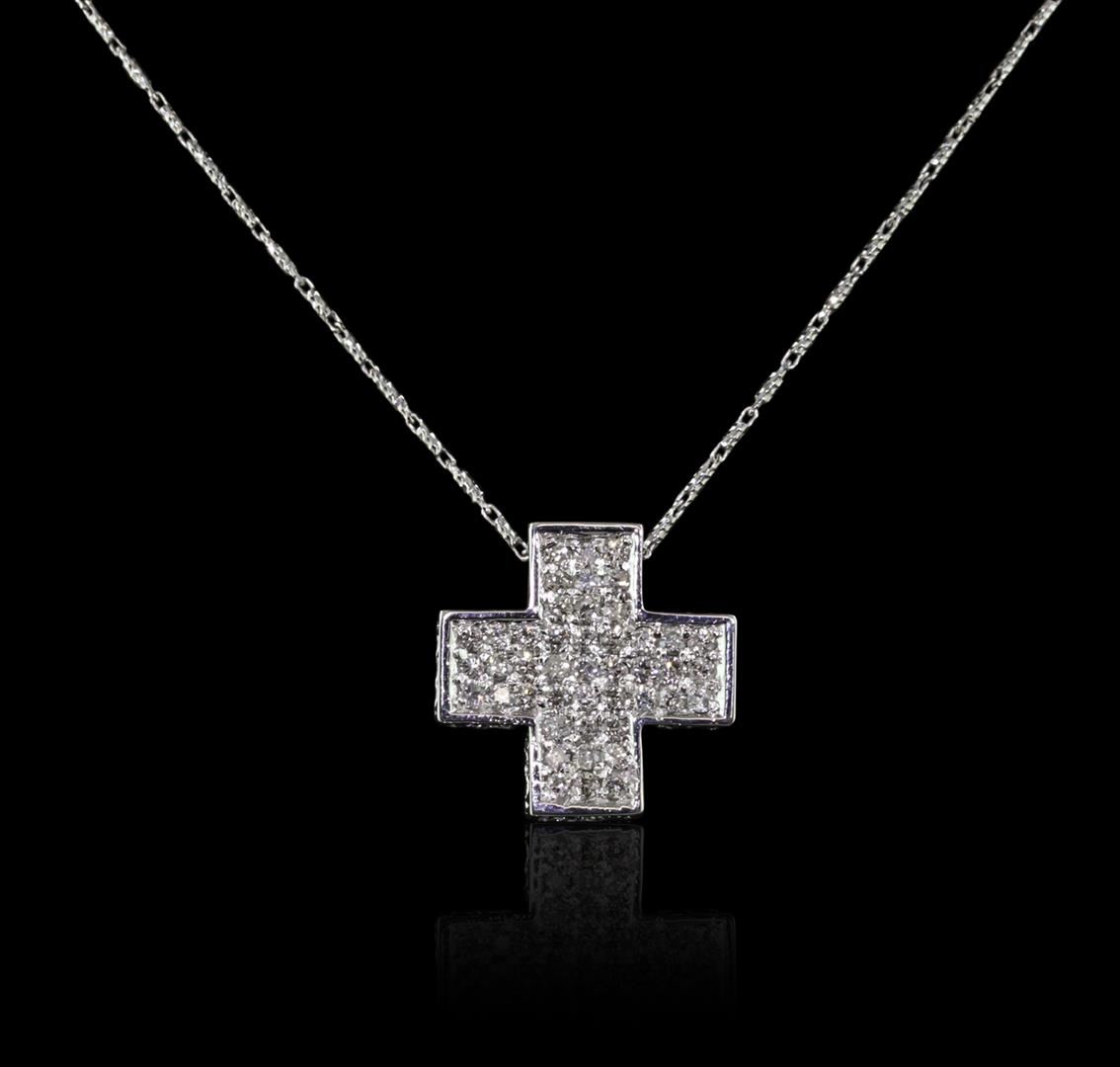 One electronically tested 14KT white gold ladies combination cast & assembled cross pendant & chain 18.0" long, medium fancy link with a lobster claw clasp with a bright polish finish. Identified with markings of "14K". Condition is new. Containing: Ninety-Three prong set round brilliant cut diamonds, measuring 1.80 - 1.60 x 1.02mm (depth est.) approximate total weight of 93 Stones = 1.67ct. Clarity: SI-1 to SI-2. Color: I - J, Cut is Good. All diamonds are graded in the mounting, unless otherwise stated. Total Weight of Diamonds 1.67ct. Total Weight of Pendant & Chain 8.30 grams. GGL Appraised at $6,120.00.