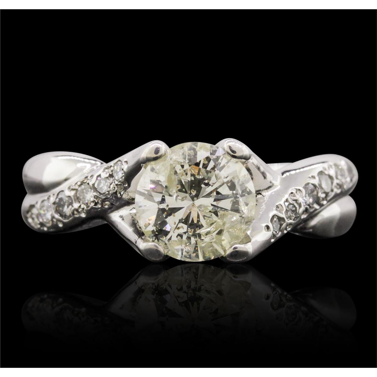 One electronically tested 14KT white gold ladies combination cast & assembled engagement ring with a bright polish finish. Condition is very good. Identified with markings of "14K". Containing: One prong set round brilliant cut diamond, measuring 7.45 - 7.41 x 4.46mm (depth est.) approximate weight of 1.50ct. Clarity: I-1. Color: L, Cut is Good. Twelve prong set triangle brilliant cut diamonds, measuring 1.80 x 1.50 x 0.93mm (depth est.) approximate. Total Weight of 12 Stones = 0.17ct. Clarity: I-1 to I-2. Color: I - J, Cut is Good. All diamonds are graded in the mounting, unless otherwise stated. Total Weight of Diamonds 1.67ct. Total Weight of Ring 7.00 grams. GGL Appraised at $21,035.00.