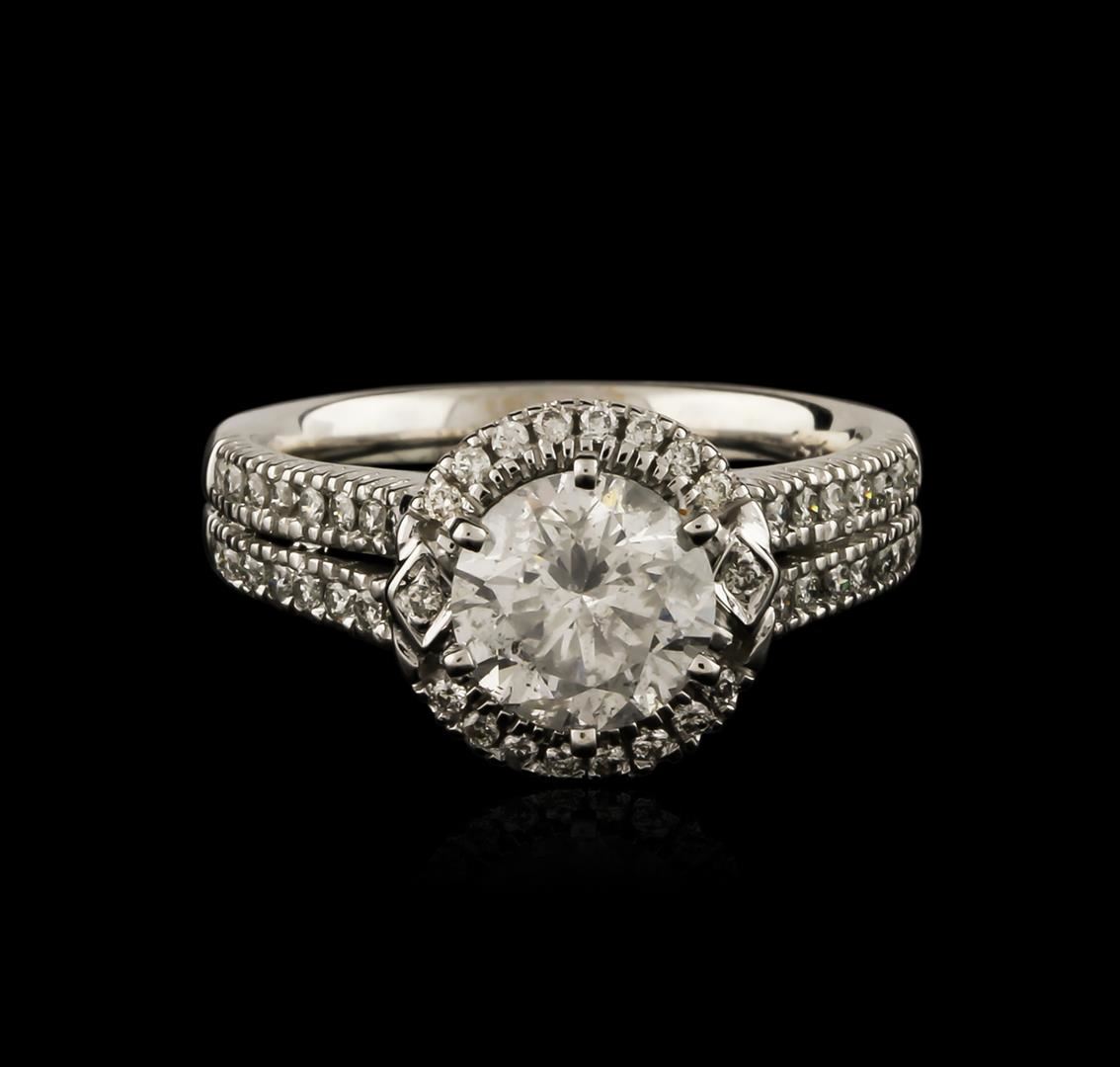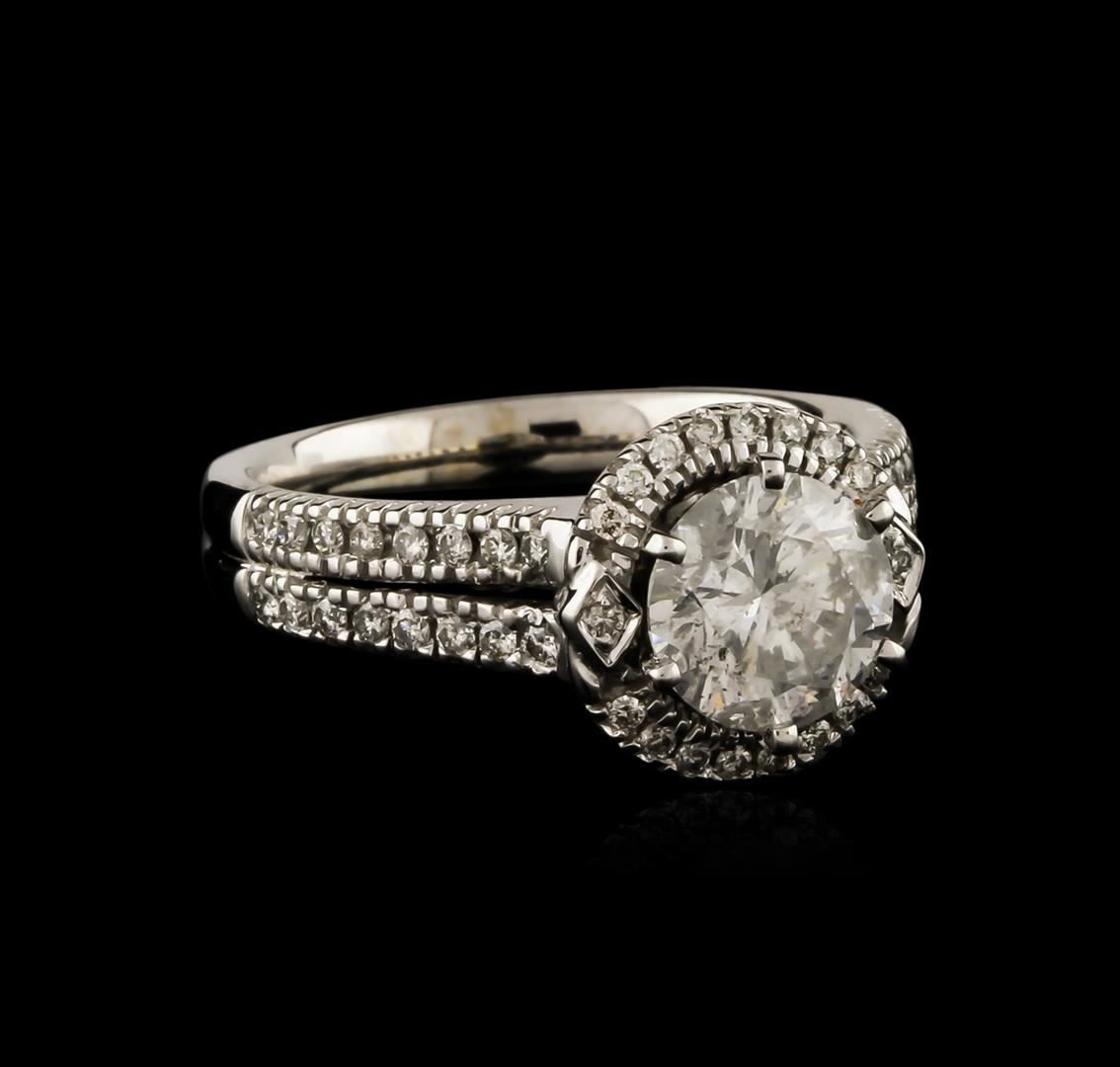 One electronically tested 14KT white gold ladies cast diamond engagement ring with a bright polish finish. Identified with markings of "14KT". Condition is new. Containing: One prong set round brilliant cut diamond, measuring 7.20 - 7.20 x 4.32mm (depth est.) approximate weight of 1.37ct. Clarity: I-1. Color: G. Forty-Eight prong set round brilliant cut diamonds, measuring 1.20 - 1.20 x 0.72mm (depth est.) approximate total weight of 48 Stones = 0.30ct. Clarity: SI-2 to I-1. Color: I - J, Cut is Good. All diamonds are graded in the mounting, unless otherwise stated. Total Weight of Diamonds 1.67ct. Total Weight of Engagement Ring 7.20 grams. GGL Appraised at $12,120.00.