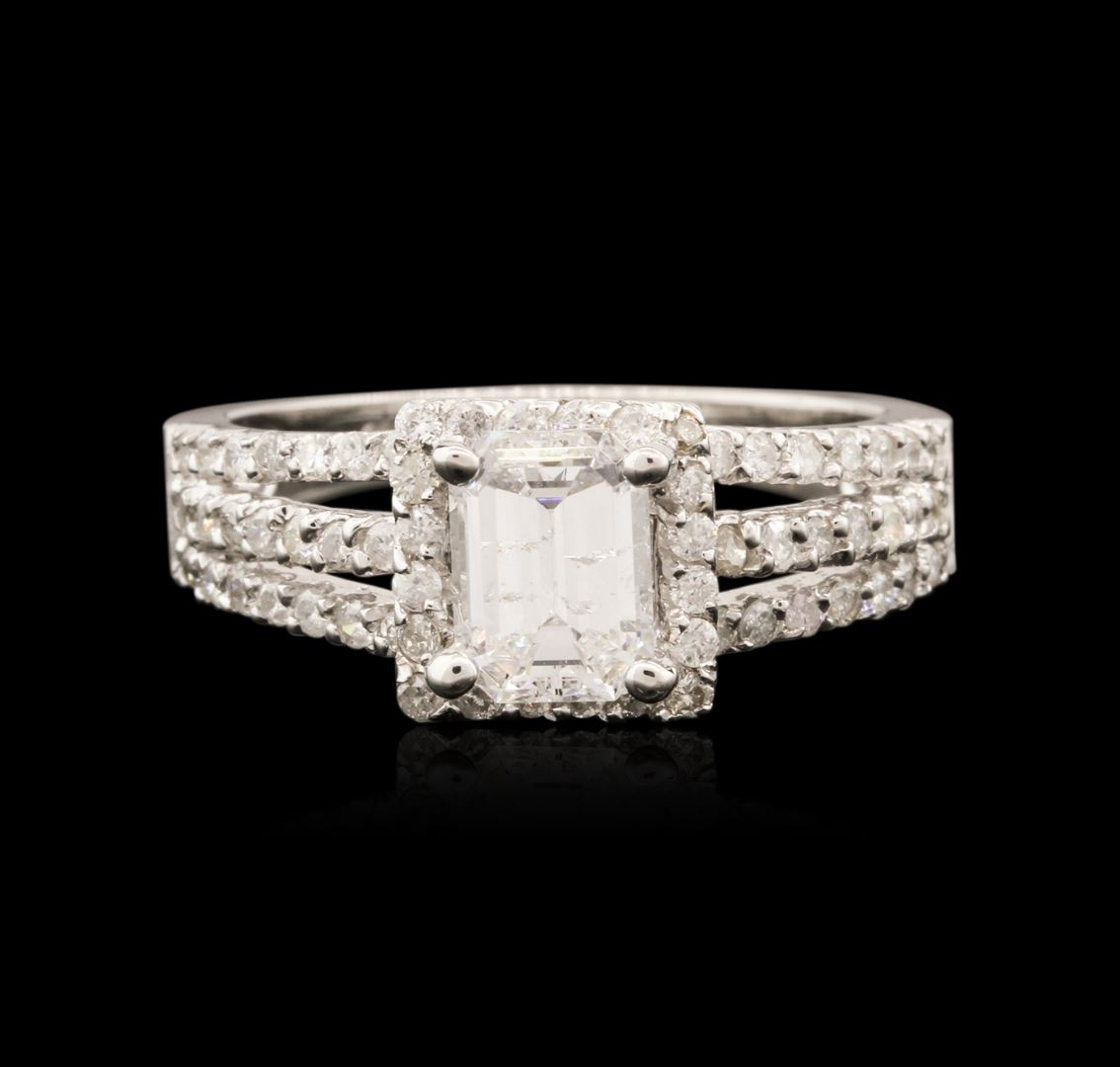 One electronically tested 14KT white gold ladies combination cast & assembled diamond engagement ring with a tapered shank with a bright polish finish. Identified with markings of "14K". Condition is new. Containing: One prong set emerald cut diamond, measuring 6.85 x 5.00 x 3.37mm (depth est.) approximate weight of 1.06ct. Clarity: I-1. Color: G, Cut is Good. Sixty-Two prong set round brilliant cut diamonds, measuring 1.50 - 1.30 x 0.84mm (depth est.) approximate total weight of 62 Stones = 0.62ct. Clarity: I-1 to I-2. Color: G - H, Cut is Good. All diamonds are graded in the mounting, unless otherwise stated. Total Weight of Diamonds 1.68ct. Total Weight of Engagement Ring 3.60 grams. GGL Appraised at $8,490.00.