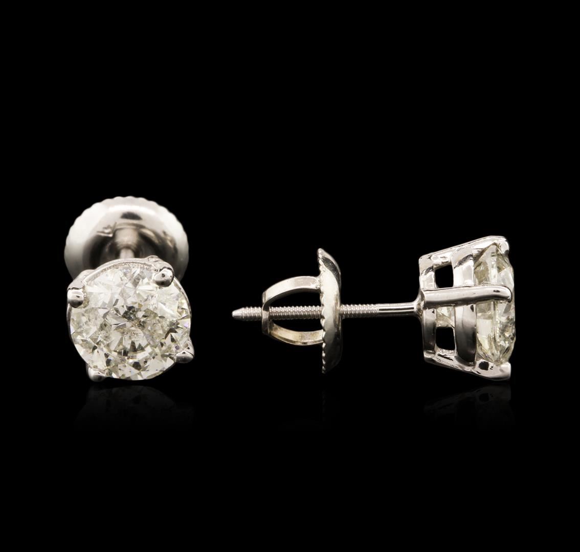 One pair electronically tested 14KT white gold ladies cast diamond stud earrings with French screw backs with a bright polish finish. Condition is new. Containing: One prong set round brilliant cut diamond, measuring 6.21 - 6.19 x 3.74mm (depth est.) approximate weight of 0.88ct. Clarity: I-3. Color: J, Cut is Good. One prong set round brilliant cut diamond, measuring 6.05 - 6.04 x 3.63mm (depth est.) approximate weight of 0.81ct. Clarity: I-3. Color: J, Cut is Good. All diamonds are graded in the mounting, unless otherwise stated. Total Weight of Diamonds 1.69ct. Total Weight of Stud Earrings 1.40 grams. GGL Appraised at $3,915.00.
