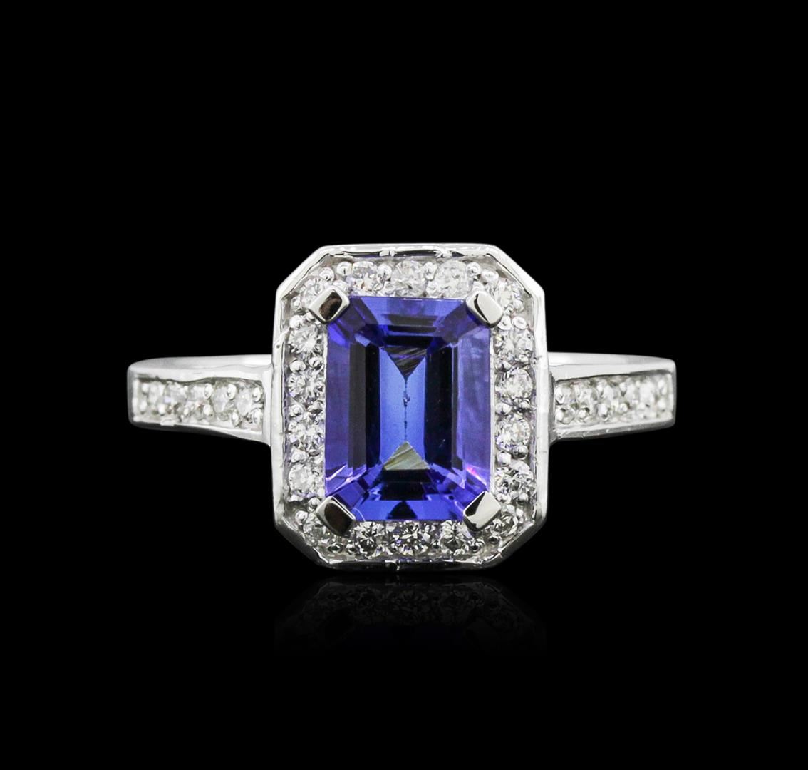 One electronically tested 14KT white gold ladies cast tanzanite and diamond ring with a bright polish finish. Identified with markings of "14K". Condition is new. Containing: One prong set emerald standard step cut natural tanzanite, measuring 8.00 x 6.00 x 3.90mm, approximate weight of 1.69ct., clarity is eye clean, type I, medium light, very slightly grayish, bluish violet color, (GIA bV 4/3), cut is good. Thirty-Two prong set round brilliant cut diamonds, measuring 1.30 - 1.30 x 0.78mm (depth est.) approximate total weight of 32 Stones = 0.26ct. Clarity: SI-1 to SI-2. Color: H - I, Cut is Good. Colored gemstones are presumed to have been subjected to commonly used enhancement processes. All diamonds and colored gemstones are graded in the mounting, unless otherwise stated. Total Weight of Colored Stones 1.69ct. Total Weight of Diamonds 0.26ct. Total Weight of Ring 5.40 grams. GGL Appraised at $3,355.00.