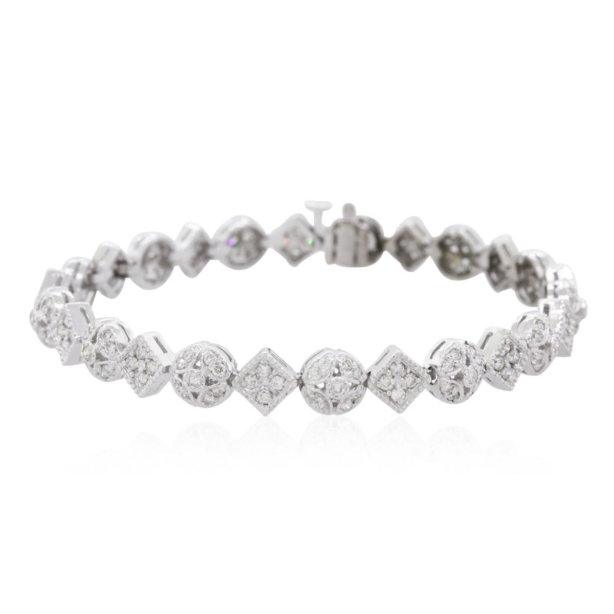 One electronically tested 14KT white gold ladies combination cast & assembled diamond bracelet with a hidden box clasp with safety closer with a bright polish finish. Measurements: 7" in length. Identified with markings of "14K". Condition is new. Containing: One Hundred Sixty-Nine prong set round brilliant cut diamonds, measuring 1.40 - 1.40 x 0.84mm (depth est.) approximate total weight of 169 Stones = 1.69ct. Clarity: SI-2 to I-1. Color: I - J, Cut is Good. All diamonds are graded in the mounting, unless otherwise stated. Total Weight of Diamonds 1.69ct. Total Weight of Bracelet 16.10 grams. GGL Appraised at $7,805.00.
