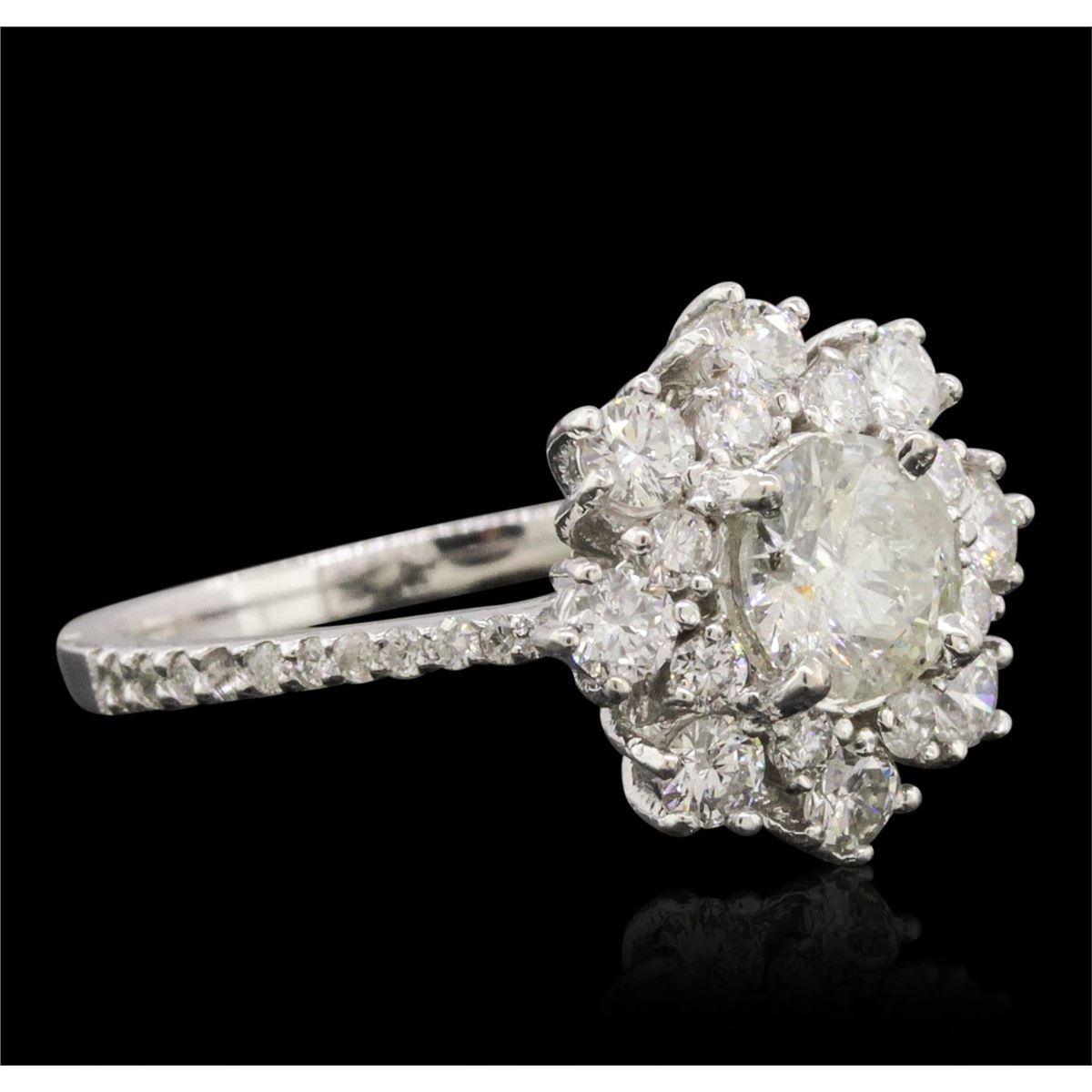 One electronically tested 14KT white gold ladies combination cast & assembled engagement ring with a bright polish finish. Condition is new. Identified with markings of "14K". Containing: One prong set round brilliant cut diamond, measuring 6.08 - 6.08 x 3.92mm (depth est.) approximate weight of 0.88ct. Clarity: I-2. Color: M, Cut is Good. Eight prong set round brilliant cut diamonds, measuring 2.50 - 2.50 x 1.50mm (depth est.) approximate. Total Weight of 8 Stones = 0.46ct. Clarity: SI-1 to SI-2. Color: J - K, Cut is Good. Twenty-Eight prong set round brilliant cut diamonds, measuring 1.80 - 1.20 x 0.90mm (depth est.) approximate. Total Weight of 28 Stones = 0.34ct. Clarity: SI-1 to I-1. Color: H - J, Cut is Good. All diamonds are graded in the mounting, unless otherwise stated. Total Weight of Diamonds 1.69ct. Total Weight of Ring 3.90 grams. GGL Appraised at $6,855.00.
