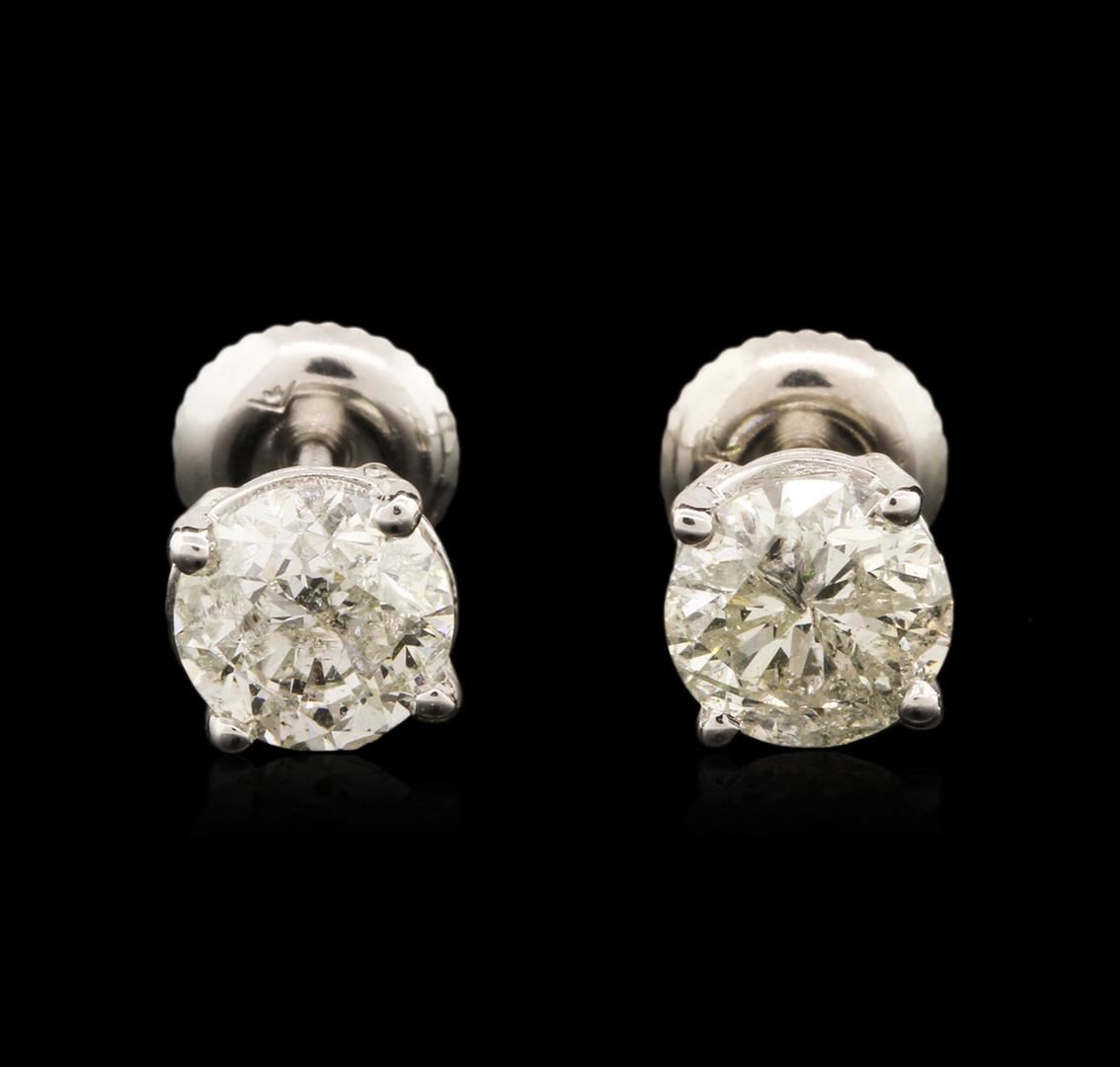 One pair electronically tested 14KT white gold ladies cast diamond stud earrings with French screw backs with a bright polish finish. Condition is new. Containing: One prong set round brilliant cut diamond, measuring 6.21 - 6.19 x 3.74mm (depth est.) approximate weight of 0.88ct. Clarity: I-3. Color: J, Cut is Good. One prong set round brilliant cut diamond, measuring 6.05 - 6.04 x 3.63mm (depth est.) approximate weight of 0.81ct. Clarity: I-3. Color: J, Cut is Good. All diamonds are graded in the mounting, unless otherwise stated. Total Weight of Diamonds 1.69ct. Total Weight of Stud Earrings 1.40 grams. GGL Appraised at $3,915.00.