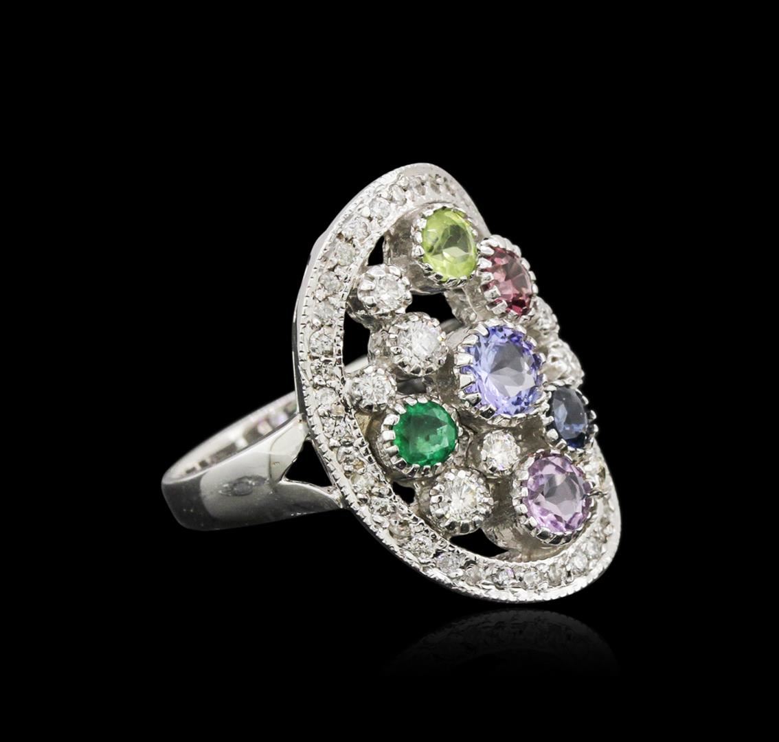 One electronically tested 14KT white gold ladies cast multi gemstone and diamond ring. The ring features an organized multi gemstone and diamond cluster set within a diamond bezel, completed by a two and one-half millimeter wide band. Bright polish finish with milgrain detailing. Identified with markings of "K14". Condition is new, good workmanship. Containing: One bezel set round brilliant cut natural amethyst, measuring 5.00 - 5.00 x 2.55 mm, approximate weight of 0.34ct., clarity is eye clean, type II, medium, very slightly grayish, purple color, (GIA P 5/3), cut is good. Transmitting light with no distortion, transparent. Graded in the setting. One bezel set round brilliant cut natural almandite garnet, measuring 4.00 - 4.00 x 2.30 mm, approximate weight of 0.30ct., clarity is eye clean, type II, dark, very slightly brownish, strongly purplish red color, (GIA stpR 7/3), cut is good. Transmitting light with no distortion, transparent. Graded in the setting. Two bezel set round brilliant cut natural blue and pink sapphires, measuring 4.00 - 3.50 x 2.44 mm, approximate total weight of 0.62ct., clarity is eye clean, cut is good. Transmitting light with no distortion, transparent. Graded in the setting. One bezel set round brilliant cut natural peridot, measuring 4.00 - 4.00 x 2.60 mm, approximate weight of 0.28ct., clarity is eye clean, type II, medium dark, very slightly grayish, yellowish green color, (GIA yG 6/3), cut is good. Transmitting light with no distortion, transparent. Graded in the setting. One bezel set round brilliant cut natural emerald, measuring 3.50 - 3.50 x 2.28 mm, approximate weight of 0.15ct., clarity is moderately included, type III, medium dark, very slightly grayish, very slightly bluish green color, (GIA vslbG 6/3), cut is good. Transmitting light somewhat diffusely, transparent to translucent. Naturally occurring internal & external characteristics are present. Graded in the setting. Eight bezel set round brilliant cut diamonds, measuring 2.50 - 1.80 x 1.29mm (depth est.) approximate total weight of 8 Stones = 0.39ct. Graded in the setting. Clarity: SI-1 to I-1. Color: G - I Forty prong set round brilliant cut diamonds, measuring 1.30 - 1.20 x 0.75mm (depth est.) approximate total weight of 40 Stones = 0.38ct. Graded in the setting. Clarity: SI-1 to I-1. Color: G - I. Total Weight of Colored Stones 1.69ct. Total Weight of Diamonds 0.77ct. Total Weight of Ring 8.79 grams. AIG Appraised at $4,295.00.