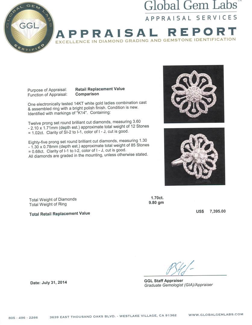 One electronically tested 14KT white gold ladies combination cast & assembled ring with a bright polish finish. Condition is new. Identified with markings of "K14". Containing: Twelve prong set round brilliant cut diamonds, measuring 3.60 - 2.10 x 1.71mm (depth est.) approximate. Total Weight of 12 Stones = 1.02ct. Clarity: SI-2 to I-1. Color: I - J, Cut is Good. Eighty-Five prong set round brilliant cut diamonds, measuring 1.30 - 1.30 x 0.78mm (depth est.) approximate. Total Weight of 85 Stones = 0.68ct. Clarity: I-1 to I-2. Color: I - J, Cut is Good. All diamonds are graded in the mounting, unless otherwise stated. Total Weight of Diamonds 1.70 ct. Total Weight of Ring 9.80 grams. GGL Appraised.