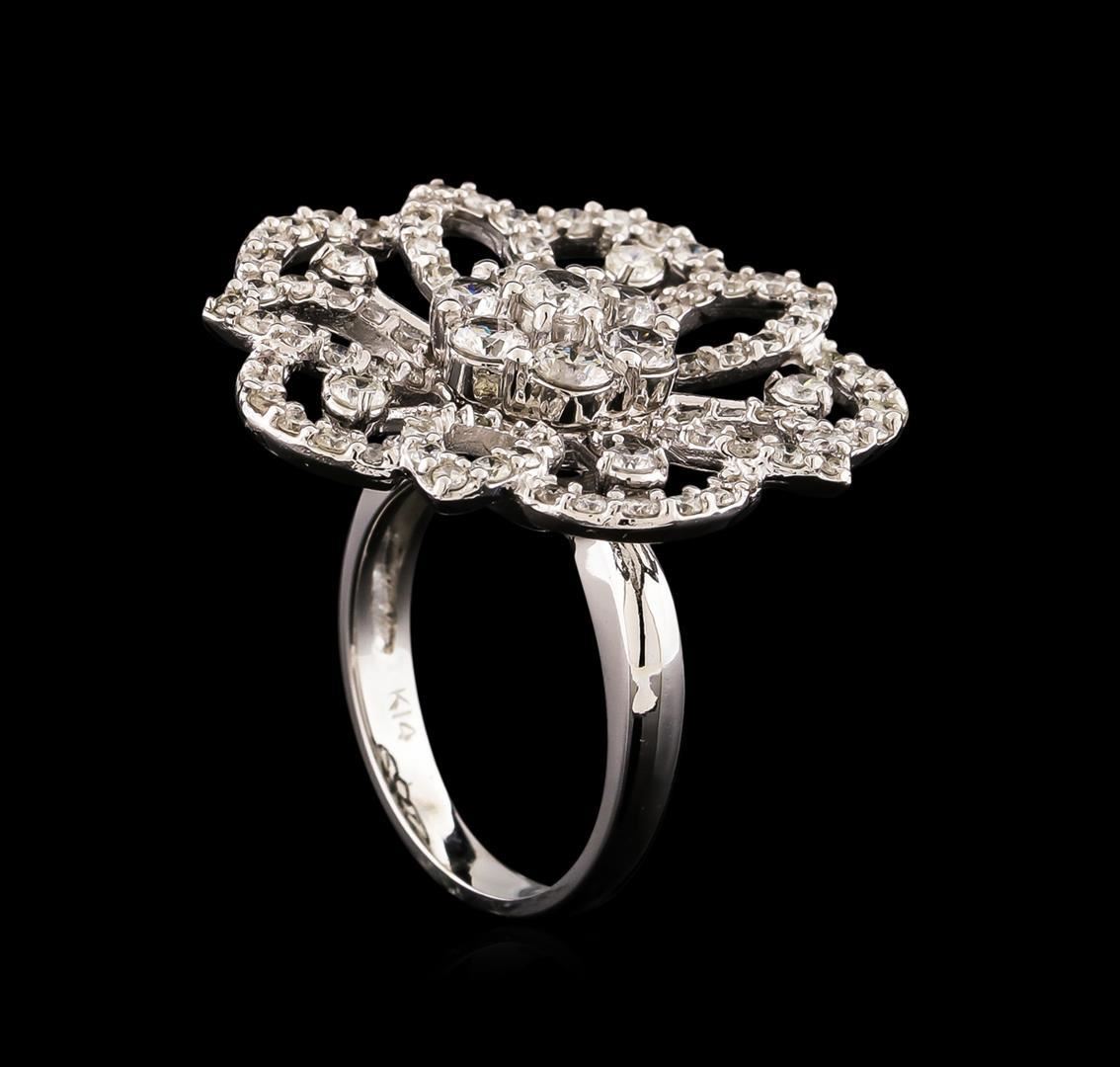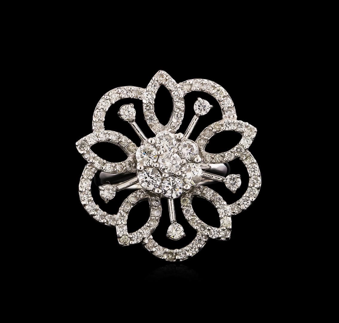 One electronically tested 14KT white gold ladies combination cast & assembled ring with a bright polish finish. Condition is new. Identified with markings of "K14". Containing: Twelve prong set round brilliant cut diamonds, measuring 3.60 - 2.10 x 1.71mm (depth est.) approximate. Total Weight of 12 Stones = 1.02ct. Clarity: SI-2 to I-1. Color: I - J, Cut is Good. Eighty-Five prong set round brilliant cut diamonds, measuring 1.30 - 1.30 x 0.78mm (depth est.) approximate. Total Weight of 85 Stones = 0.68ct. Clarity: I-1 to I-2. Color: I - J, Cut is Good. All diamonds are graded in the mounting, unless otherwise stated. Total Weight of Diamonds 1.70 ct. Total Weight of Ring 9.80 grams. GGL Appraised.