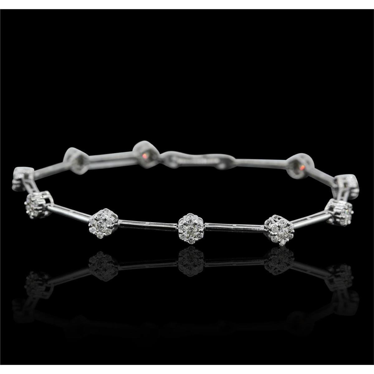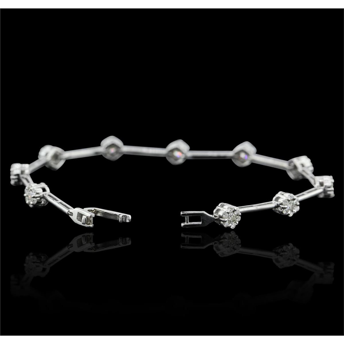 One electronically tested 14KT white gold ladies combination cast & assembled bracelet with a foldover clasp with a bright polish finish. Condition is new. Measurements: 7" in length. Containing: Ten invisible set round brilliant cut diamonds, measuring 2.80 - 2.80 x 1.68mm (depth est.) approximate total weight of 10 Stones = 0.80ct. Clarity: SI-1 to SI-2. Color: I - J, Cut is Good. Sixty prong set round brilliant cut diamonds, measuring 1.60 - 1.60 x 0.96mm (depth est.) approximate total weight of 60 Stones = 0.89ct. Clarity: SI-2 to I-1. Color: H - I, Cut is Good. All diamonds are graded in the mounting, unless otherwise stated. Total Weight of Diamonds 1.70ct. Total Weight of Bracelet 9.80 grams. GGL Appraised at $8,180.00.