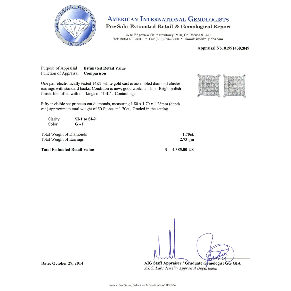 One pair electronically tested 14KT white gold cast & assembled diamond cluster earrings with standard backs. Bright polish finish. Identified with markings of "14K". Condition is new, good workmanship. Containing: Fifty invisible set princess cut diamonds, measuring 1.80 x 1.70 x 1.28mm (depth est.) approximate total weight of 50 Stones = 1.70ct. Graded in the setting. Clarity: SI-1 to SI-2. Color: G - I. Total Weight of Diamonds 1.70ct. Total Weight of Earrings 2.73 grams. AIG Appraised at $4,385.00.