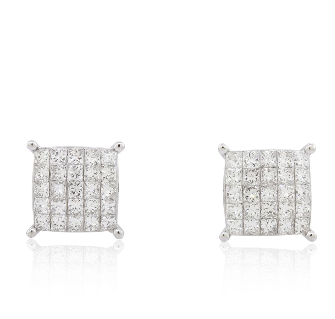 One pair electronically tested 14KT white gold cast & assembled diamond cluster earrings with standard backs. Bright polish finish. Identified with markings of "14K". Condition is new, good workmanship. Containing: Fifty invisible set princess cut diamonds, measuring 1.80 x 1.70 x 1.28mm (depth est.) approximate total weight of 50 Stones = 1.70ct. Graded in the setting. Clarity: SI-1 to SI-2. Color: G - I. Total Weight of Diamonds 1.70ct. Total Weight of Earrings 2.73 grams. AIG Appraised at $4,385.00.