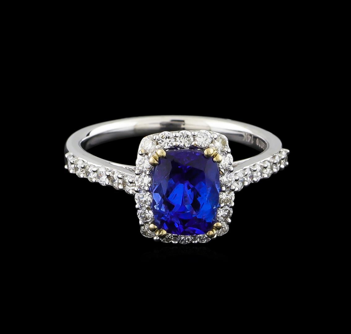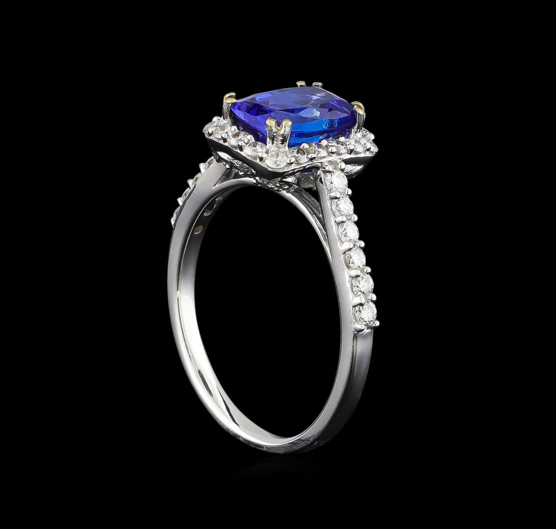 One electronically tested 14KT white gold ladies cast tanzanite and diamond ring with a bright polish finish. The featured tanzanite is set within a diamond ring supported by diamond set shoulders, completed by a one and one-half millimeter wide band. Trademark is Orianne. Identified with markings of "14K". Condition is new, good workmanship. Containing: One prong set rectangular cushion brilliant cut natural tanzanite, measuring 8.10 x 6.20 x 4.00mm, 8% bulge factor, approximate weight of 1.71ct., clarity is eye clean, type I, medium dark, very slightly grayish, violetish blue color, (GIA vB 6/3), cut is good. Transmitting light with no distortion, transparent. Graded in the setting. Tanzanite is a very rare gemstone that is only found in the country of Tanzania. Originally discovered in 1967. Tiffany & Company, named the stone Tanzanite. It is found in the Usumburu Mountains that border the Umba Valley of northern Tanzania. Tanzanite occurs in gray, brown, violet, blue, reddish-purple, & green. The gem is interesting because of its exceptional pleochroism. Rotated in different directions a tanzanite will exhibit multiple changes of color. Tanzanite has a low tolerance to ultrasonic cleaning, and should not be cleaned using this method. Fifty-Four prong set round brilliant cut diamonds, measuring 1.70 - 1.60 x 0.99mm (depth est.) approximate total weight of 54 Stones = 0.98ct. Graded in the setting. Clarity: SI-1 to I-1. Color: H - J. Total Weight of Colored Stones 1.71ct. Total Weight of Diamonds 0.98ct. Total Weight of Ring 3.56 grams. AIG Appraised at $6,845.00.