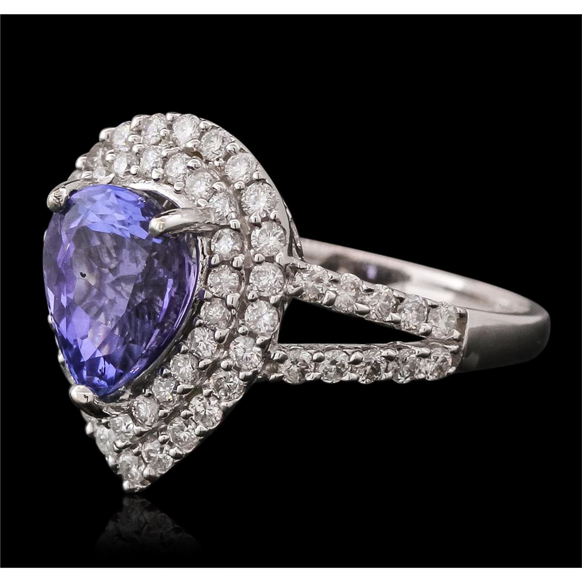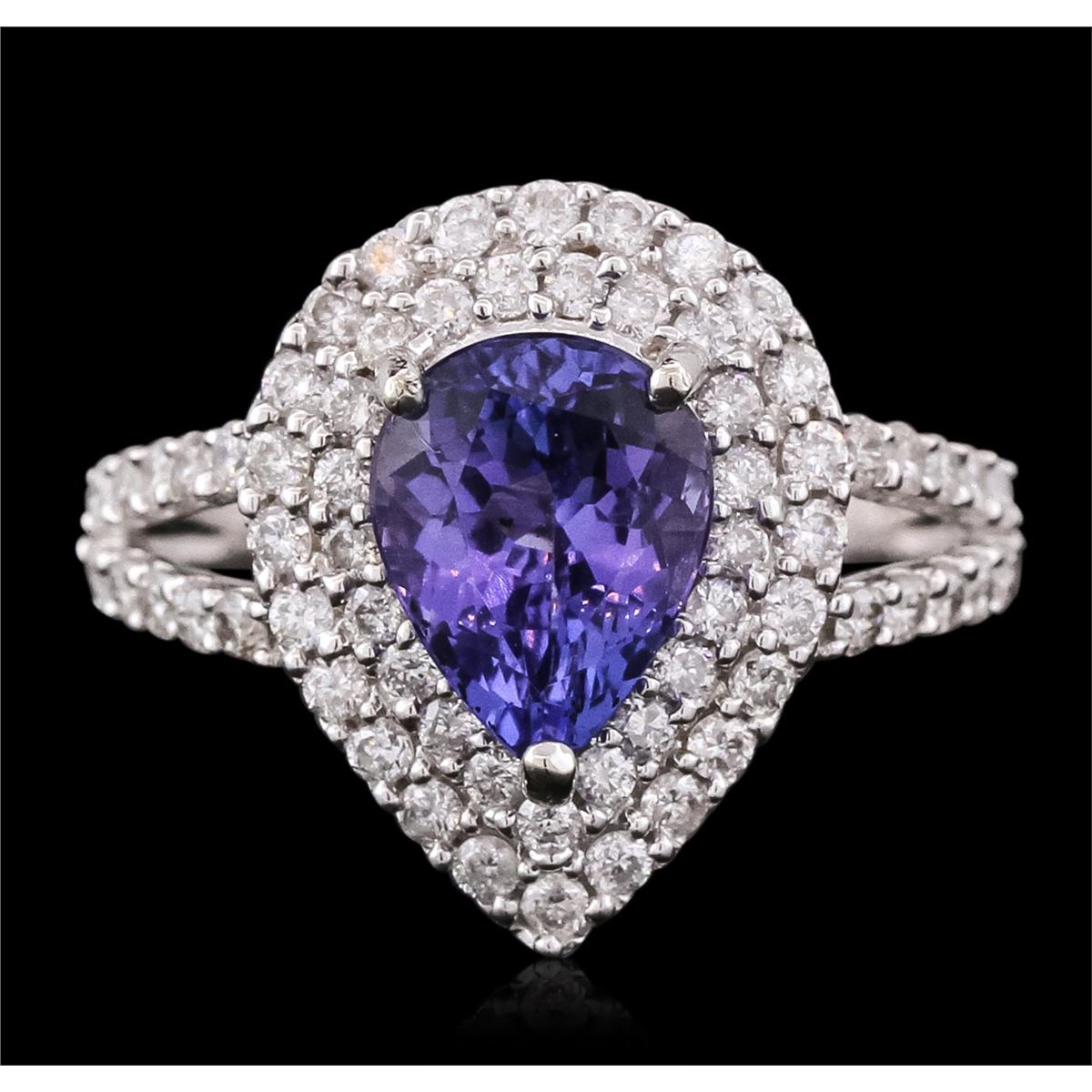 One electronically tested 14KT white gold ladies combination cast & assembled tanzanite and diamond ring with a split shank with a bright polish finish. Identified with markings of "14K". Condition is new. Containing: One prong set pear modified brilliant cut natural tanzanite, measuring 8.00 x 7.00 x 4.55mm, approximate weight of 1.71ct., clarity is eye clean, type I, medium, moderately strong, violet color, (GIA V 5/4), cut is good. Sixty-Eight prong set round brilliant cut diamonds, measuring 1.40 - 1.40 x 0.84mm (depth est.) approximate total weight of 68 Stones = 0.68ct. Clarity: SI-2 to I-2. Color: I - J, Cut is Good. Colored gemstones are presumed to have been subjected to commonly used enhancement processes. All diamonds and colored gemstones are graded in the mounting, unless otherwise stated. Total Weight of Colored Stones 1.71ct. Total Weight of Diamonds 0.68ct. Total Weight of Ring 4.20 grams. GGL Appraised at $5,080.00.