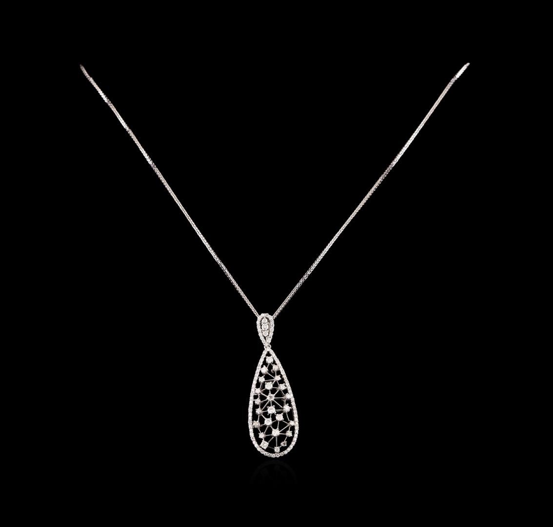 One electronically tested 14KT white gold ladies combination cast & assembled diamond pendant & chain 18.0 long, medium cable link with a lobster claw clasp with a bright polish finish. Identified with markings of 14K. Condition is new. Containing: One Hundred Five prong set round brilliant cut diamonds, measuring 2.20 - 1.10 x 0.99mm (depth est.) approximate total weight of 105 Stones = 1.72ct. Clarity: SI-2 to I-2. Color: I - J, Cut is Good. All diamonds are graded in the mounting, unless otherwise stated. Total Weight of Diamonds 1.72ct. Total Weight of Pendant & Chain 8.30 grams. GGL Appraised at $4,885.00.