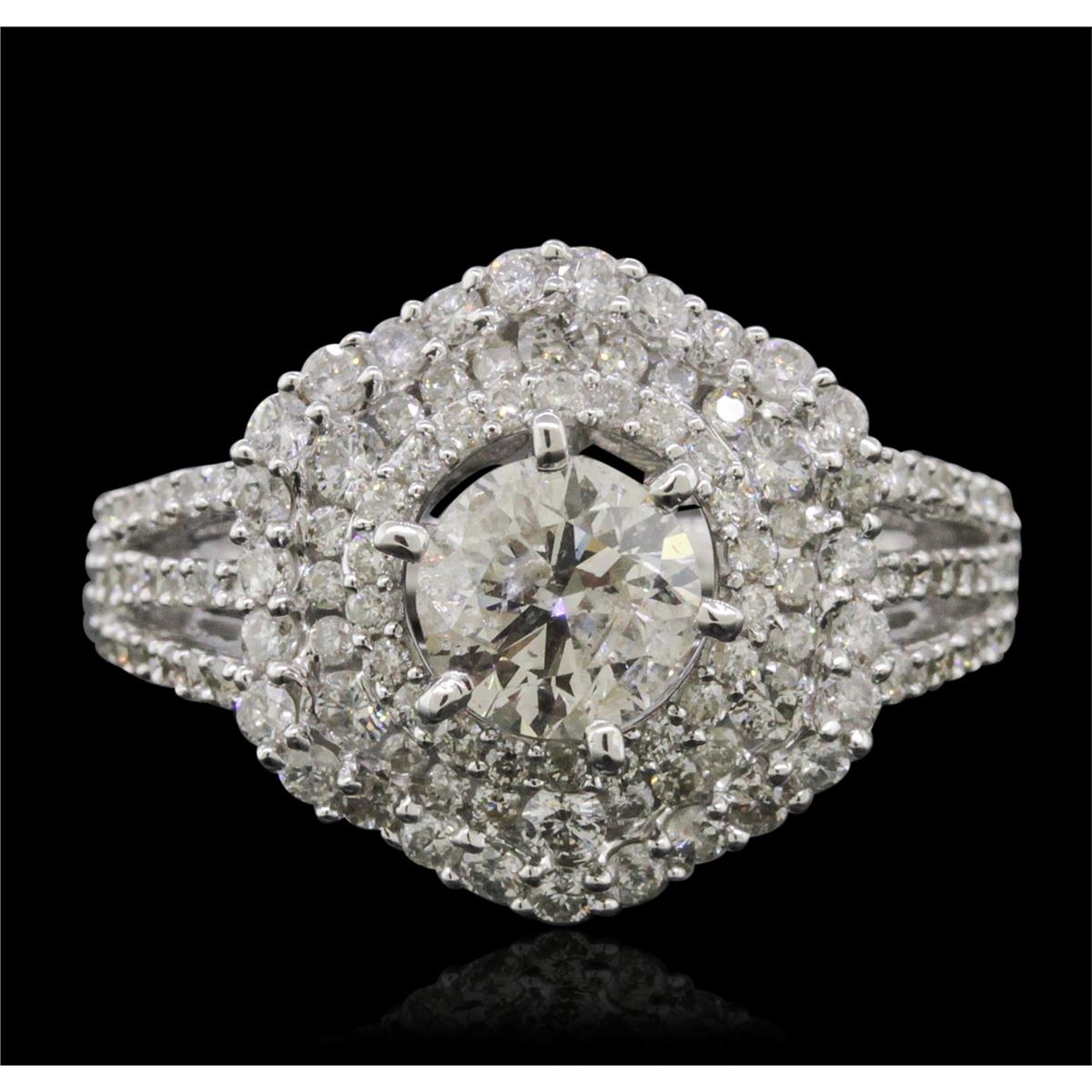 One electronically tested 14KT white gold ladies combination cast & assembled engagement ring with a split shank with a bright polish finish. Identified with markings of "14K". Condition is new. Containing: One prong set round brilliant cut diamond, measuring 6.33 - 6.32 x 3.70mm (depth est.) approximate weight of 0.90ct. Clarity: I-1. Color: K, Cut is Good. One Hundred Fifteen prong set round brilliant cut diamonds, measuring 1.50 - 1.00 x 0.75mm (depth est.) approximate total weight of 115 Stones = 0.82ct. Clarity: SI-2 to I-2. Color: I - J, Cut is Good. All diamonds are graded in the mounting, unless otherwise stated. Total Weight of Diamonds 1.72ct. Total Weight of Ring 6.10 grams. GGL Appraised at $11,100.00.