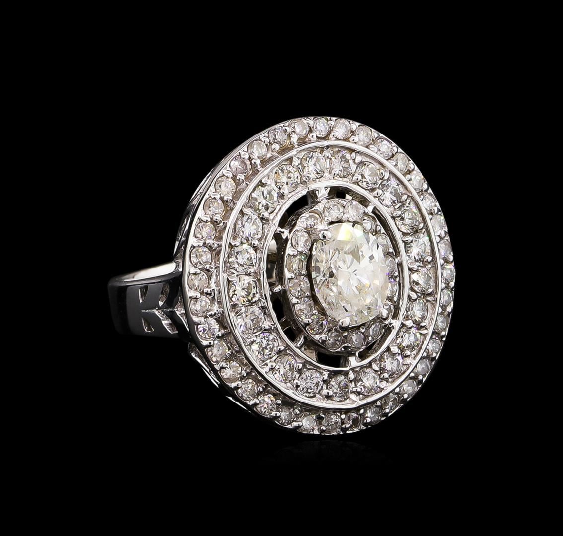One electronically tested 14KT white gold Ladies engagement ring with a bright polish finish. Condition is new. Identified with markings of "14K". Containing: One prong set oval shaped cut diamond, measuring 6.30 x 5.10 x 3.21mm (depth est.) approximate weight of 0.65ct. Clarity: I-1. Color: J, Cut is Good. Seventy-Two prong set round brilliant cut diamonds, measuring 1.70 - 1.50 x 0.96mm (depth est.) approximate. Total Weight of 72 Stones = 1.07ct. Clarity: I-1 to I-2. Color: H - I, Cut is Good. Total Weight of Diamonds 1.72ct. Total Weight of Ring 6.40 grams. GGL Appraised at $7,050.00.