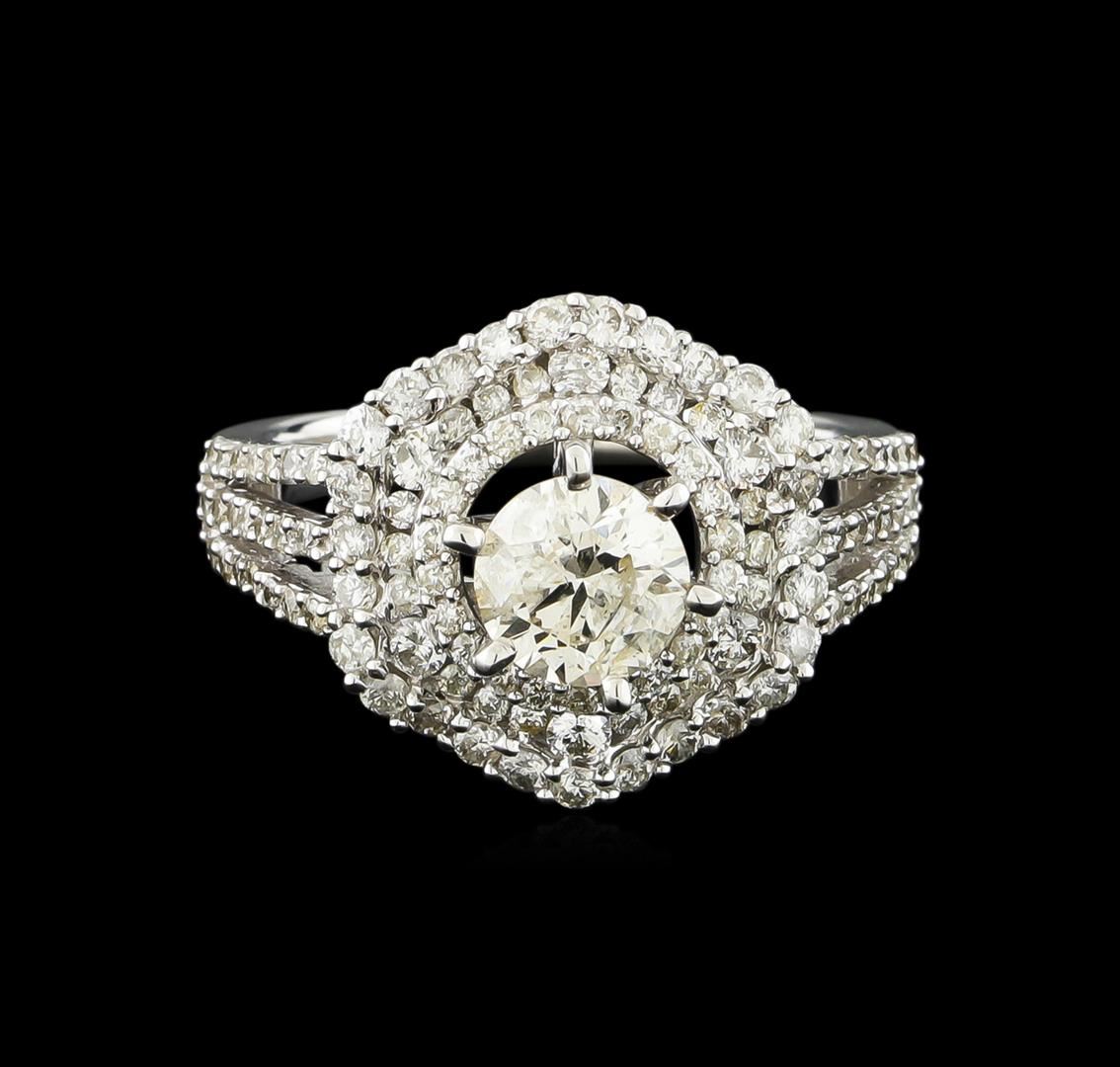 One electronically tested 14KT white gold ladies combination cast & assembled engagement ring with a split shank with a bright polish finish. Identified with markings of "14K". Condition is new. Containing: One prong set round brilliant cut diamond, measuring 6.33 - 6.32 x 3.70mm (depth est.) approximate weight of 0.90ct. Clarity: I-1. Color: K, Cut is Good. One Hundred Fifteen prong set round brilliant cut diamonds, measuring 1.50 - 1.00 x 0.75mm (depth est.) approximate total weight of 115 Stones = 0.82ct. Clarity: SI-2 to I-2. Color: I - J, Cut is Good. All diamonds are graded in the mounting, unless otherwise stated. Total Weight of Diamonds 1.72ct. Total Weight of Ring 6.10 grams. GGL Appraised at $11,100.00.