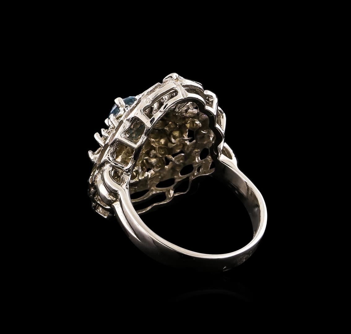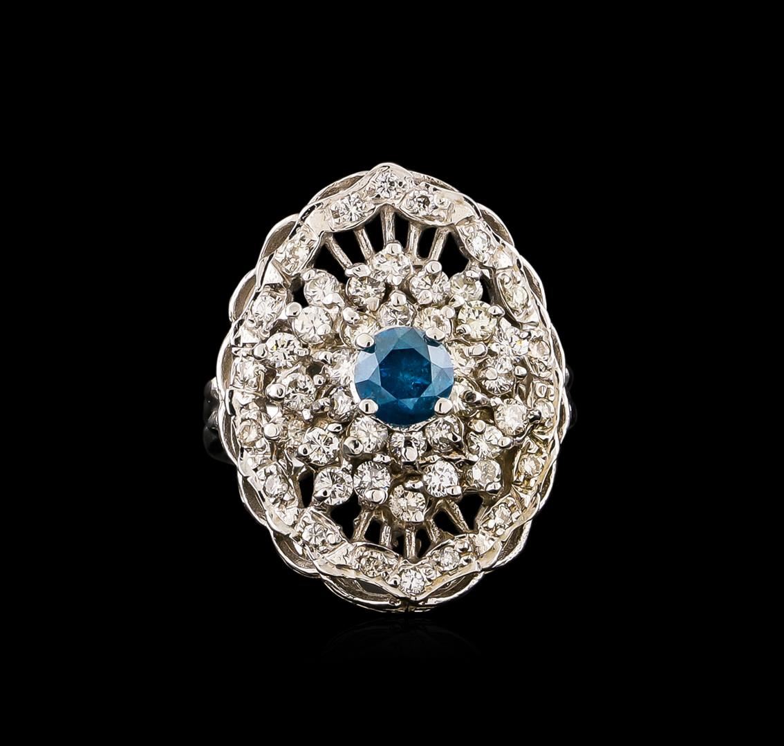 One electronically tested 14KT white gold ladies cast diamond ring with a bright polish finish. Condition is new, good workmanship. The featured diamond is set within a diamond bouquet, supported by split shoulders and completed by a three millimeter wide band. Identified with markings of "K14". Containing: One prong set round brilliant cut diamond, measuring 5.20 - 5.15 x 3.40mm (depth est.) approximate weight of 0.60ct. Indications of laboratory irradiated enhanced color. Graded in the setting. Clarity: I-2. Depth: 65.6%. Table 56.0%. Thirty prong set round brilliant cut diamonds, measuring 2.10 - 2.00 x 1.23mm (depth est.) approximate. Total Weight of 30 Stones = 0.94ct. Graded in the setting. Clarity: SI-1 to SI-2. Color: G - I Eighteen prong set round brilliant cut diamonds, measuring 1.40 - 1.40 x 0.84mm (depth est.) approximate. Total Weight of 18 Stones = 0.18ct. Graded in the setting. Clarity: SI-1 to I-1. Color: G - I. Total Weight of Diamonds 1.72ct. Total Weight of Ring 7.40 grams. AIG Appraised at $6,400.00.