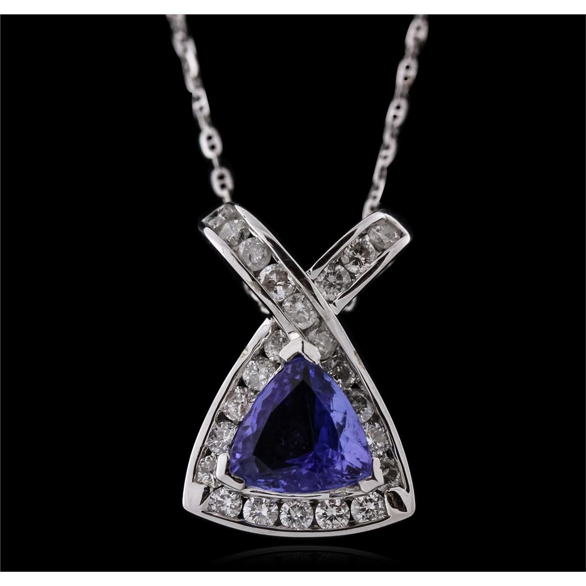 One electronically tested 14KT white gold ladies cast & assembled tanzanite and diamond pendant with chain. The pendant features a tanzanite set within a diamond bezel, completed by diamond set shoulders. The pendant is supported by an eighteen inch length 14KT white gold designer style chain, terminating in a lobster claw clasp. Bright polish finish. Trademark is Orianne. Identified with markings of "14K". Condition is new, good workmanship. Containing: One prong set triangle brilliant cut natural tanzanite, measuring 8.00 x 7.90 x 4.25mm, 6% bulge factor, approximate weight of 1.72ct., clarity is eye clean, type I, medium dark, very slightly grayish, violetish blue color, (GIA vB 6/3), cut is good. Transmitting light with no distortion, transparent. Graded in the setting. Tanzanite is a very rare gemstone that is only found in the country of Tanzania. Originally discovered in 1967. Tiffany & Company, named the stone Tanzanite. It is found in the Usumburu Mountains that border the Umba Valley of northern Tanzania. Tanzanite occurs in gray, brown, violet, blue, reddish-purple, & green. The gem is interesting because of its exceptional pleochroism. Rotated in different directions a tanzanite will exhibit multiple changes of color. Tanzanite has a low tolerance to ultrasonic cleaning, and should not be cleaned using this method. Twenty-Three channel set round brilliant cut diamonds, measuring 2.20 - 2.10 x 1.29mm (depth est.) approximate total weight of 23 Stones = 0.93ct. Graded in the setting. Clarity: I-1 to I-2. Color: H - J. Total Weight of Colored Stones 1.72ct. Total Weight of Diamonds 0.93ct. Total Weight of Pendant With Chain 4.13 grams. AIG Appraised at $5,990.00.
