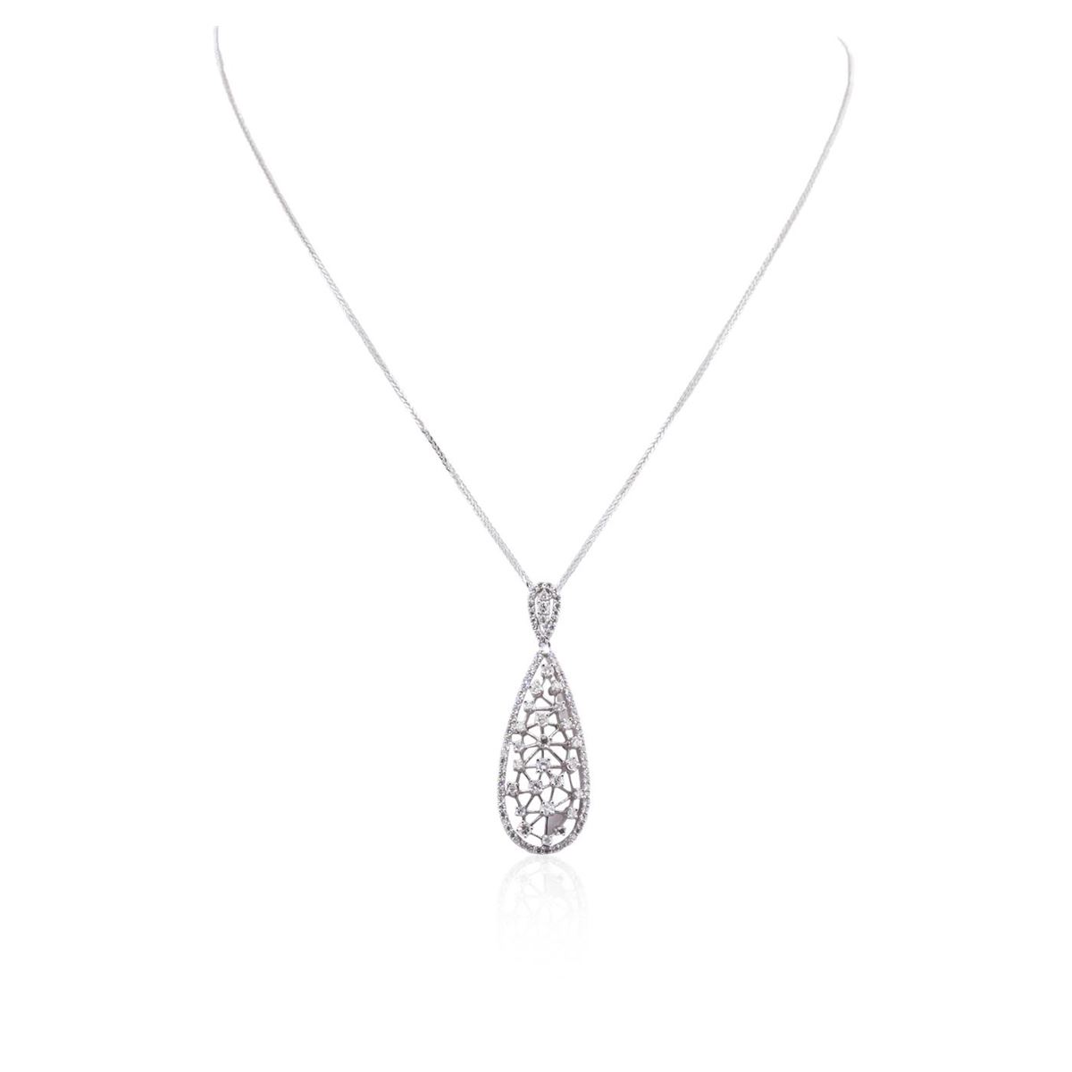 One electronically tested 14KT white gold ladies combination cast & assembled diamond pendant & chain 18.0 long, medium cable link with a lobster claw clasp with a bright polish finish. Identified with markings of 14K. Condition is new. Containing: One Hundred Five prong set round brilliant cut diamonds, measuring 2.20 - 1.10 x 0.99mm (depth est.) approximate total weight of 105 Stones = 1.72ct. Clarity: SI-2 to I-2. Color: I - J, Cut is Good. All diamonds are graded in the mounting, unless otherwise stated. Total Weight of Diamonds 1.72ct. Total Weight of Pendant & Chain 8.30 grams. GGL Appraised at $4,885.00.