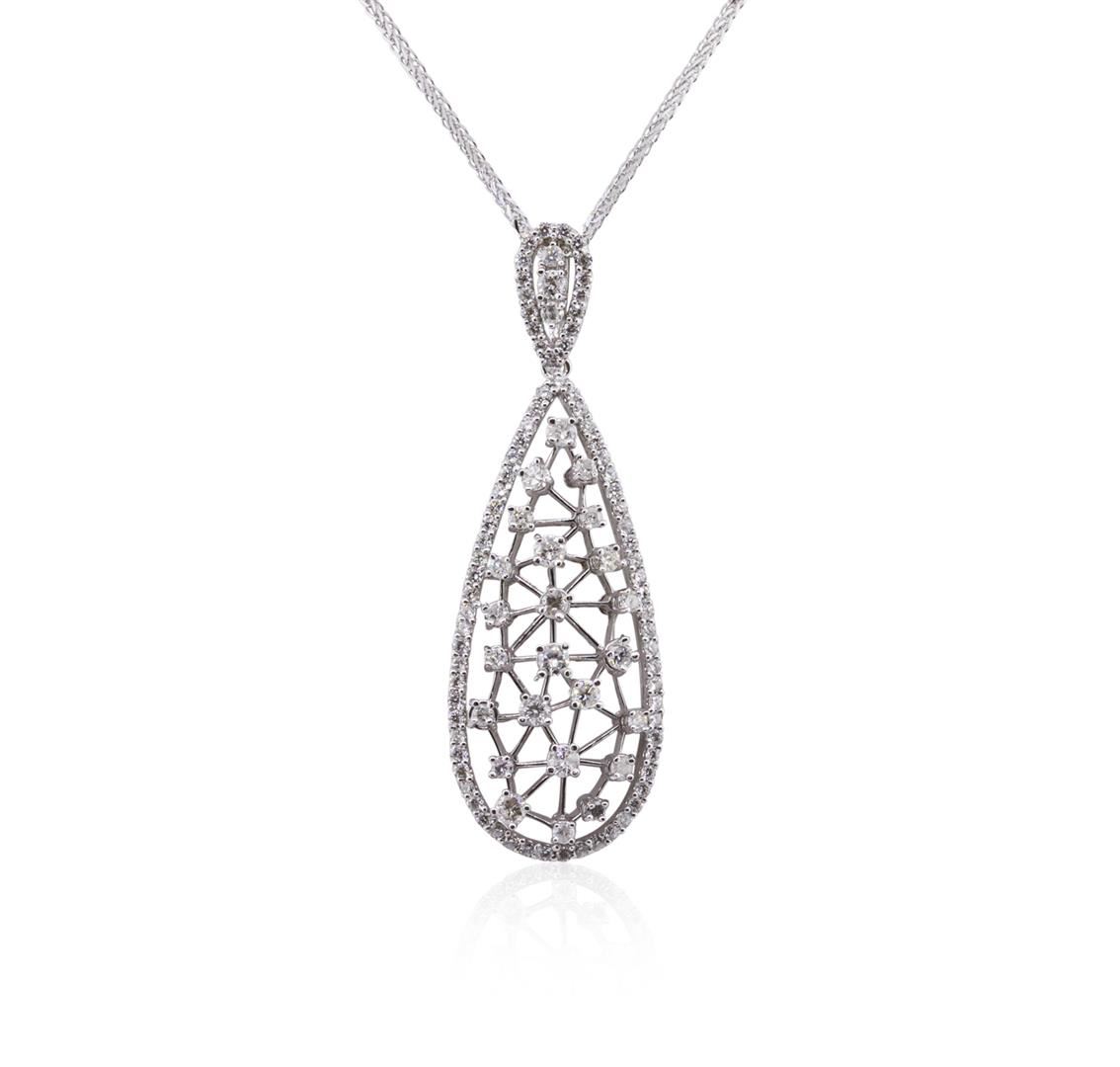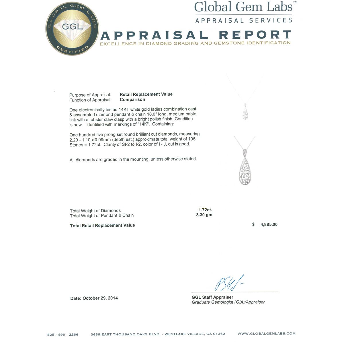 One electronically tested 14KT white gold ladies combination cast & assembled diamond pendant & chain 18.0 long, medium cable link with a lobster claw clasp with a bright polish finish. Identified with markings of 14K. Condition is new. Containing: One Hundred Five prong set round brilliant cut diamonds, measuring 2.20 - 1.10 x 0.99mm (depth est.) approximate total weight of 105 Stones = 1.72ct. Clarity: SI-2 to I-2. Color: I - J, Cut is Good. All diamonds are graded in the mounting, unless otherwise stated. Total Weight of Diamonds 1.72ct. Total Weight of Pendant & Chain 8.30 grams. GGL Appraised at $4,885.00.