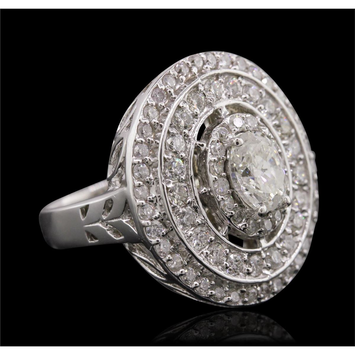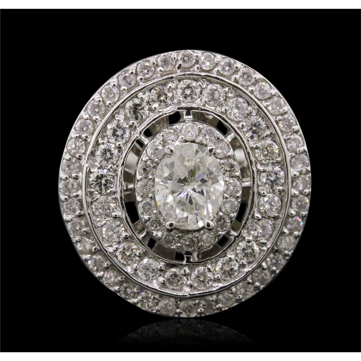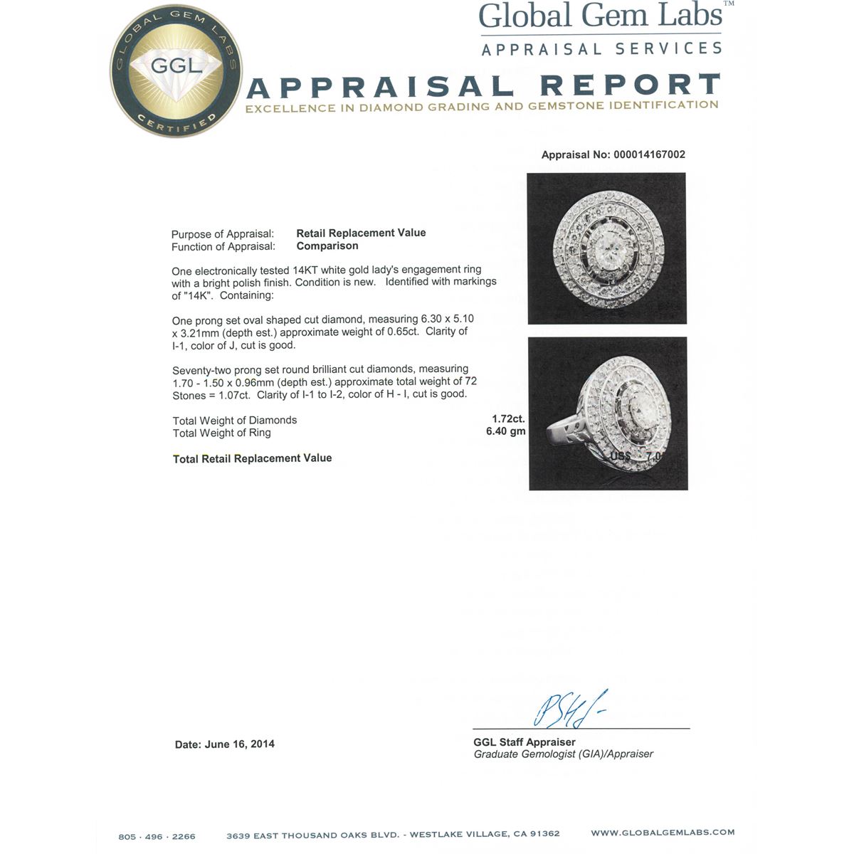 One electronically tested 14KT white gold Ladies engagement ring with a bright polish finish. Condition is new. Identified with markings of "14K". Containing: One prong set oval shaped cut diamond, measuring 6.30 x 5.10 x 3.21mm (depth est.) approximate weight of 0.65ct. Clarity: I-1. Color: J, Cut is Good. Seventy-Two prong set round brilliant cut diamonds, measuring 1.70 - 1.50 x 0.96mm (depth est.) approximate. Total Weight of 72 Stones = 1.07ct. Clarity: I-1 to I-2. Color: H - I, Cut is Good. Total Weight of Diamonds 1.72ct. Total Weight of Ring 6.40 grams. GGL Appraised at $7,050.00.