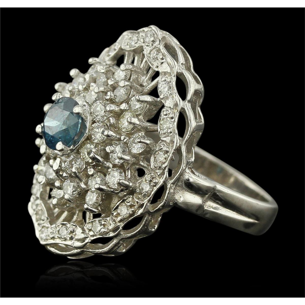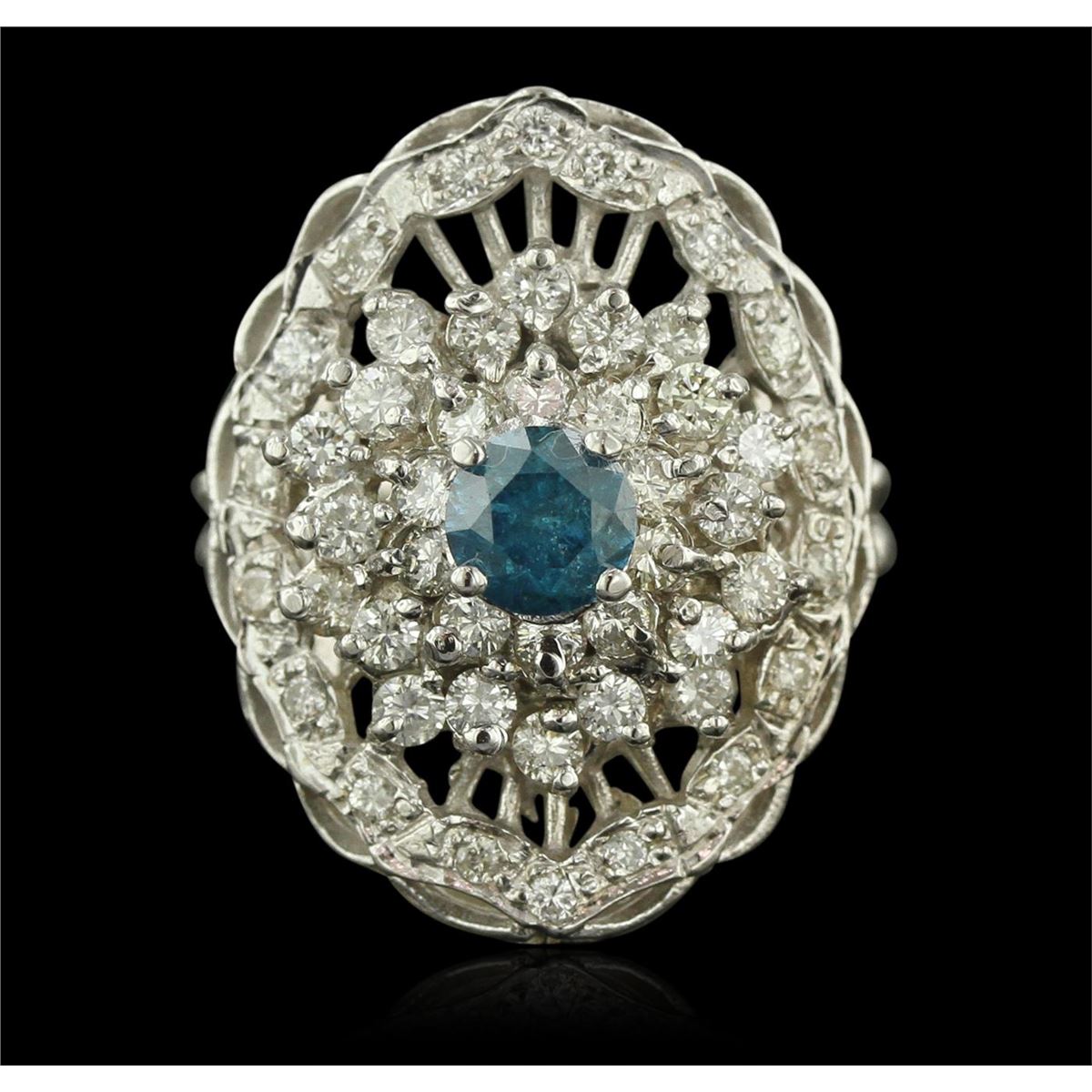 One electronically tested 14KT white gold ladies cast diamond ring with a bright polish finish. Condition is new, good workmanship. The featured diamond is set within a diamond bouquet, supported by split shoulders and completed by a three millimeter wide band. Identified with markings of "K14". Containing: One prong set round brilliant cut diamond, measuring 5.20 - 5.15 x 3.40mm (depth est.) approximate weight of 0.60ct. Indications of laboratory irradiated enhanced color. Graded in the setting. Clarity: I-2. Depth: 65.6%. Table 56.0%. Thirty prong set round brilliant cut diamonds, measuring 2.10 - 2.00 x 1.23mm (depth est.) approximate. Total Weight of 30 Stones = 0.94ct. Graded in the setting. Clarity: SI-1 to SI-2. Color: G - I Eighteen prong set round brilliant cut diamonds, measuring 1.40 - 1.40 x 0.84mm (depth est.) approximate. Total Weight of 18 Stones = 0.18ct. Graded in the setting. Clarity: SI-1 to I-1. Color: G - I. Total Weight of Diamonds 1.72ct. Total Weight of Ring 7.40 grams. AIG Appraised at $6,400.00.