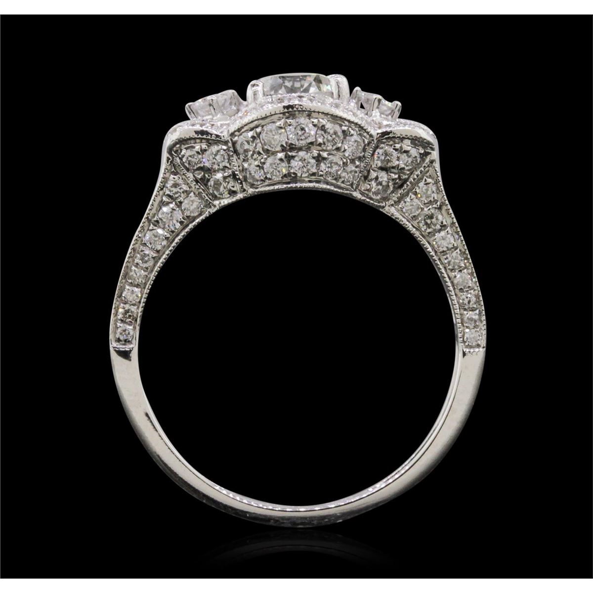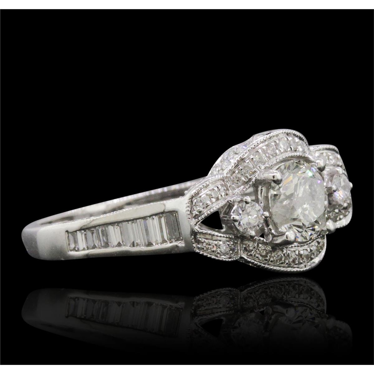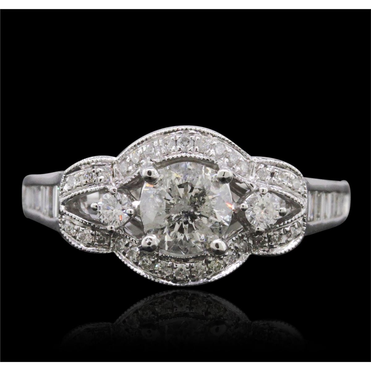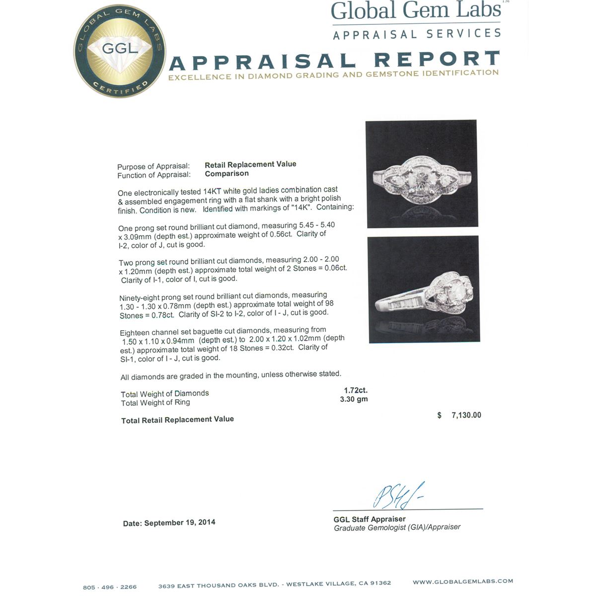 One electronically tested 14KT white gold ladies combination cast & assembled engagement ring with a flat shank with a bright polish finish. Identified with markings of "14K". Condition is new. Containing: One prong set round brilliant cut diamond, measuring 5.45 - 5.40 x 3.09mm (depth est.) approximate weight of 0.56ct. Clarity: I-2. Color: J, Cut is Good. Two prong set round brilliant cut diamonds, measuring 2.00 - 2.00 x 1.20mm (depth est.) approximate total weight of 2 Stones = 0.06ct. Clarity: I-1. Color: I, Cut is Good. Ninety-Eight prong set round brilliant cut diamonds, measuring 1.30 - 1.30 x 0.78mm (depth est.) approximate total weight of 98 Stones = 0.78ct. Clarity: SI-2 to I-2. Color: I - J, Cut is Good. Eighteen channel set baguette cut diamonds, measuring from 1.50 x 1.10 x 0.94mm (depth est.) to 2.00 x 1.20 x 1.02mm (depth est.) approximate total weight of 18 Stones = 0.32ct. Clarity: SI-1. Color: I - J, Cut is Good. All diamonds are graded in the mounting, unless otherwise stated. Total Weight of Diamonds 1.72ct. Total Weight of Ring 3.30 grams. GGL Appraised at $7,130.00.