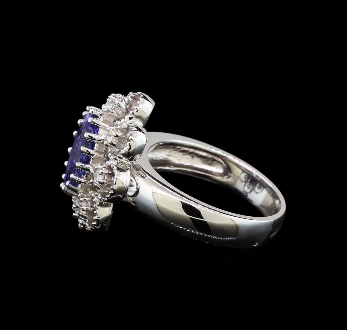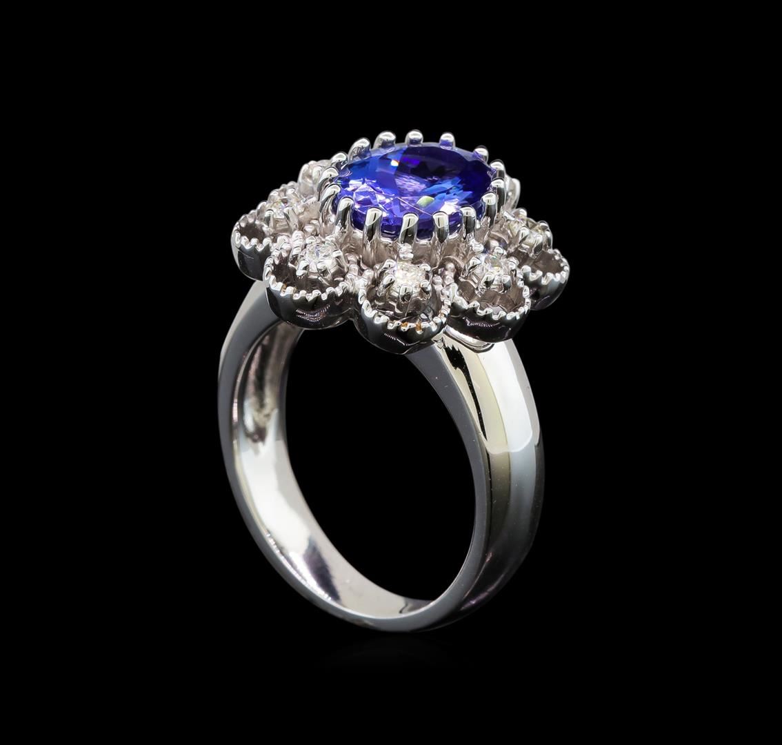 One electronically tested 14KT white gold ladies cast tanzanite and diamond ring with a bright polish finish. Identified with markings of "14K". Condition is new. Containing: One prong set oval modified brilliant cut natural tanzanite, measuring 10.50 x 6.00 x 3.90mm, approximate weight of 1.73ct., clarity is eye clean, type I, medium light, very slightly grayish, violet color, (GIA V 4/3), cut is good. Eight prong set round brilliant cut diamonds, measuring 2.00 - 2.00 x 1.20mm (depth est.) approximate total weight of 8 Stones = 0.23ct. Clarity: SI-1 to SI-2. Color: H - I, Cut is Good. Colored gemstones are presumed to have been subjected to commonly used enhancement processes. All diamonds and colored gemstones are graded in the mounting, unless otherwise stated. Total Weight of Colored Stones 1.73ct. Total Weight of Diamonds 0.23ct. Total Weight of Ring 8.10 grams. GGL Appraised at $4,235.00.