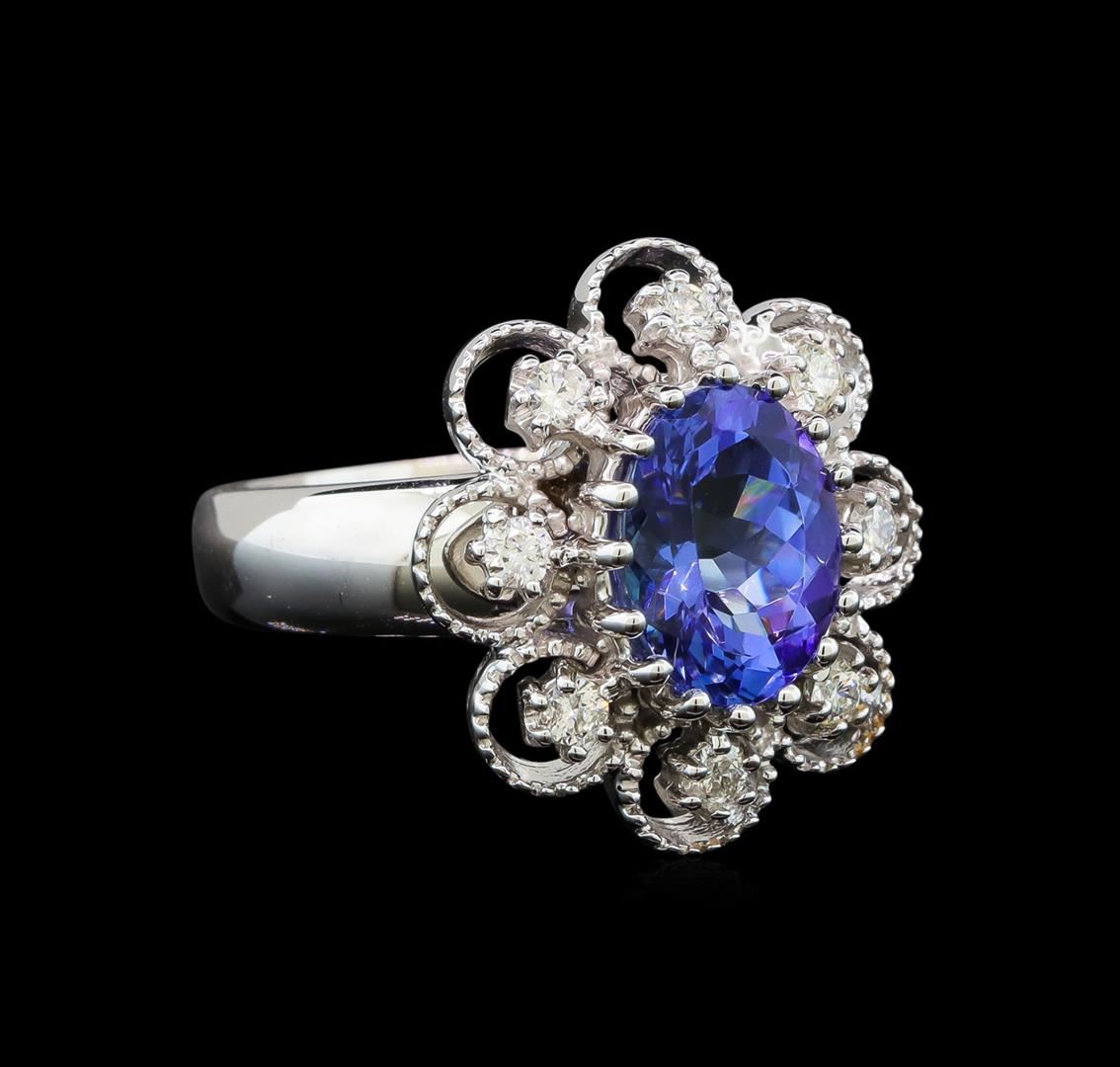 One electronically tested 14KT white gold ladies cast tanzanite and diamond ring with a bright polish finish. Identified with markings of "14K". Condition is new. Containing: One prong set oval modified brilliant cut natural tanzanite, measuring 10.50 x 6.00 x 3.90mm, approximate weight of 1.73ct., clarity is eye clean, type I, medium light, very slightly grayish, violet color, (GIA V 4/3), cut is good. Eight prong set round brilliant cut diamonds, measuring 2.00 - 2.00 x 1.20mm (depth est.) approximate total weight of 8 Stones = 0.23ct. Clarity: SI-1 to SI-2. Color: H - I, Cut is Good. Colored gemstones are presumed to have been subjected to commonly used enhancement processes. All diamonds and colored gemstones are graded in the mounting, unless otherwise stated. Total Weight of Colored Stones 1.73ct. Total Weight of Diamonds 0.23ct. Total Weight of Ring 8.10 grams. GGL Appraised at $4,235.00.