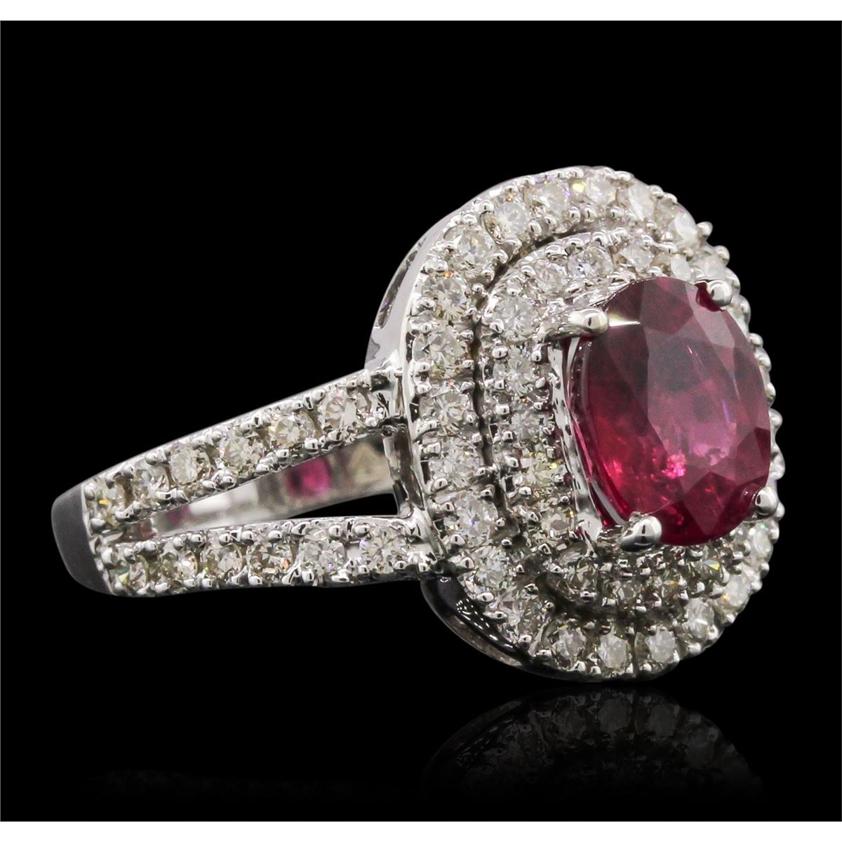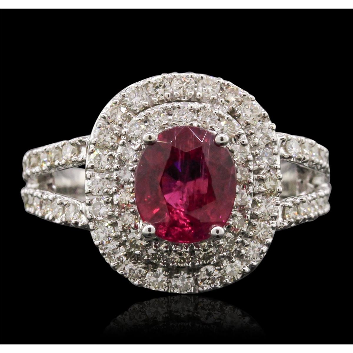 One electronically tested 14KT white gold Ladies combination cast & assembled ring with a bright polish finish. Condition is new. Identified with markings of "14K". Containing: Sixty-Six prong set round brilliant cut diamonds, measuring 1.40 - 1.40 x 0.84mm (depth est.) approximate. Total Weight of 66 Stones = 1.01ct. Clarity: I-1 to I-3. Color: K - L, Cut is Good. One prong set oval modified brilliant cut natural pink tourmaline, measuring 8.00 x 7.00 x 4.70mm, exact weight 1.73ct., clarity is eye clean, type II, medium, moderately strong, reddish purple color, (GIA rP 5/4), cut is very good. Colored gemstones are presumed to have been subjected to commonly used color/clarity enhancement processes. Total Weight of Colored Stones 1.73ct. Total Weight of Diamonds 1.01ct. Total Weight of Ring 5.50 grams. GGL Appraised at $4,580.00.