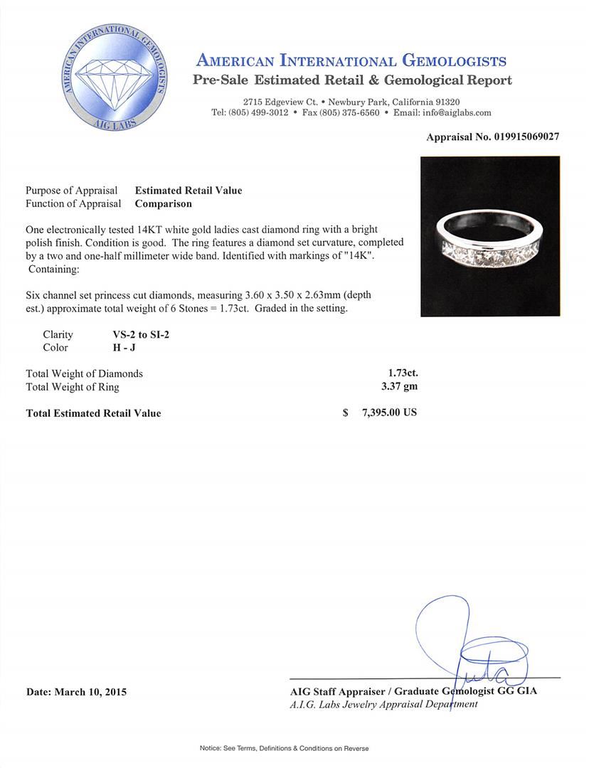One electronically tested 14KT white gold ladies cast diamond ring with a bright polish finish. The ring features a diamond set curvature, completed by a two and one-half millimeter wide band. Identified with markings of "14K". Condition is good. Containing: Six channel set princess cut diamonds, measuring 3.60 x 3.50 x 2.63mm (depth est.) approximate total weight of 6 Stones = 1.73ct. Graded in the setting. Clarity: VS-2 to SI-2. Color: H - J. Total Weight of Diamonds 1.73ct. Total Weight of Ring 3.37 grams. AIG Appraised at $7,395.00.
