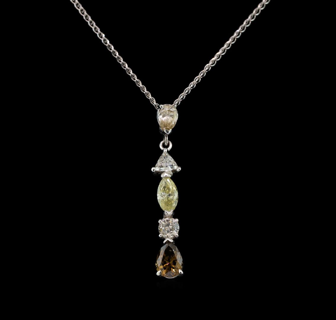 One electronically tested 14KT white gold ladies cast & assembled diamond pendant with chain. The pendant features a diamond ribbon dangle, completed by a diamond set bail. The pendant is supported by an eighteen inch length 14KT white gold designer style chain, terminating in a spring ring clasp. Bright polish finish . Condition is new, good workmanship. Containing: One prong set pear shaped cut fancy brown diamond, measuring 6.60 x 4.80 x 3.35mm (depth est.), 6.00% GTCF approximate weight of 0.70ct. Graded in the setting. Clarity: I-1 One prong set Old European cut diamond, measuring 3.55 - 3.50 x 2.40mm (depth est.), 8.00% GTCF approximate weight of 0.24ct. Cutting style circa late 19th century. Graded in the setting. Clarity: SI-2. Color: J One prong set marquise shaped cut light yellow diamond, measuring 7.00 x 3.70 x 2.55mm (depth est.) approximate weight of 0.40ct. Graded in the setting. Clarity: I-1 One prong set triangle brilliant cut diamond, measuring 4.20 x 4.10 x 1.50mm (depth est.), 6.00% GTCF approximate weight of 0.16ct. Graded in the setting. Clarity: I-1. Color: H One prong set pear shaped cut diamond, measuring 4.70 x 3.60 x 2.30mm (depth est.) approximate weight of 0.24ct. Graded in the setting. Clarity: SI-2. Color: K. Total Weight of Diamonds 1.74ct. AIG Appraised at $5,820.00.