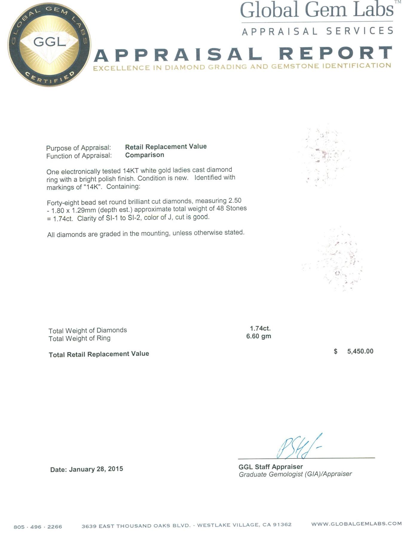 One electronically tested 14KT white gold ladies cast diamond ring with a bright polish finish. Identified with markings of "14K". Condition is new. Containing: Forty-Eight bead set round brilliant cut diamonds, measuring 2.50 - 1.80 x 1.29mm (depth est.) approximate total weight of 48 Stones = 1.74ct. Clarity: SI-1 to SI-2. Color: J, Cut is Good. All diamonds are graded in the mounting, unless otherwise stated. Total Weight of Diamonds 1.74ct. Total Weight of Ring 6.60 grams. GGL Appraised.