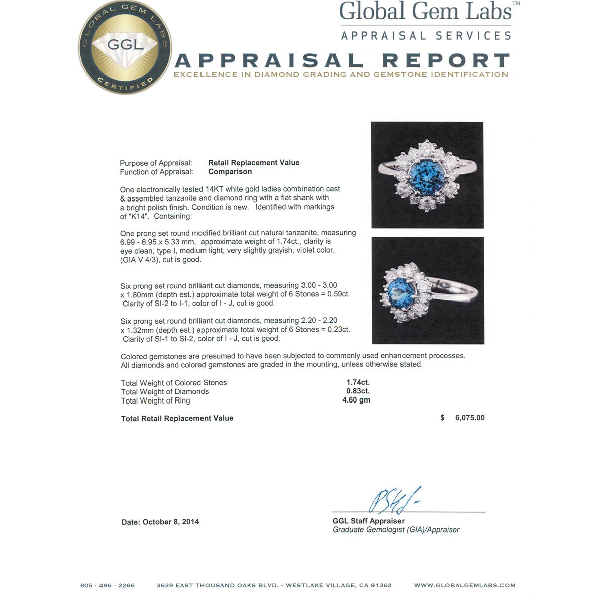 One electronically tested 14KT white gold ladies combination cast & assembled tanzanite and diamond ring with a flat shank with a bright polish finish. Identified with markings of "K14". Condition is new. Containing: One prong set round modified brilliant cut natural tanzanite, measuring 6.99 - 6.95 x 5.33 mm, approximate weight of 1.74ct., clarity is eye clean, type I, medium light, very slightly grayish, violet color, (GIA V 4/3), cut is good. Six prong set round brilliant cut diamonds, measuring 3.00 - 3.00 x 1.80mm (depth est.) approximate total weight of 6 Stones = 0.59ct. Clarity: SI-2 to I-1. Color: I - J, Cut is Good. Six prong set round brilliant cut diamonds, measuring 2.20 - 2.20 x 1.32mm (depth est.) approximate total weight of 6 Stones = 0.23ct. Clarity: SI-1 to SI-2. Color: I - J, Cut is Good. Colored gemstones are presumed to have been subjected to commonly used enhancement processes. All diamonds and colored gemstones are graded in the mounting, unless otherwise stated. Total Weight of Colored Stones 1.74ct. Total Weight of Diamonds 0.83ct. Total Weight of Ring 4.60 grams. GGL Appraised at $6,075.00.