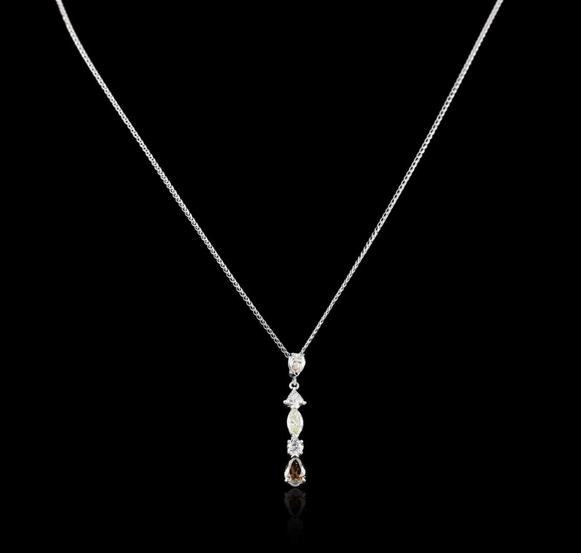 One electronically tested 14KT white gold ladies cast & assembled diamond pendant with chain. The pendant features a diamond ribbon dangle, completed by a diamond set bail. The pendant is supported by an eighteen inch length 14KT white gold designer style chain, terminating in a spring ring clasp. Bright polish finish . Condition is new, good workmanship. Containing: One prong set pear shaped cut fancy brown diamond, measuring 6.60 x 4.80 x 3.35mm (depth est.), 6.00% GTCF approximate weight of 0.70ct. Graded in the setting. Clarity: I-1 One prong set Old European cut diamond, measuring 3.55 - 3.50 x 2.40mm (depth est.), 8.00% GTCF approximate weight of 0.24ct. Cutting style circa late 19th century. Graded in the setting. Clarity: SI-2. Color: J One prong set marquise shaped cut light yellow diamond, measuring 7.00 x 3.70 x 2.55mm (depth est.) approximate weight of 0.40ct. Graded in the setting. Clarity: I-1 One prong set triangle brilliant cut diamond, measuring 4.20 x 4.10 x 1.50mm (depth est.), 6.00% GTCF approximate weight of 0.16ct. Graded in the setting. Clarity: I-1. Color: H One prong set pear shaped cut diamond, measuring 4.70 x 3.60 x 2.30mm (depth est.) approximate weight of 0.24ct. Graded in the setting. Clarity: SI-2. Color: K. Total Weight of Diamonds 1.74ct. AIG Appraised at $5,820.00.