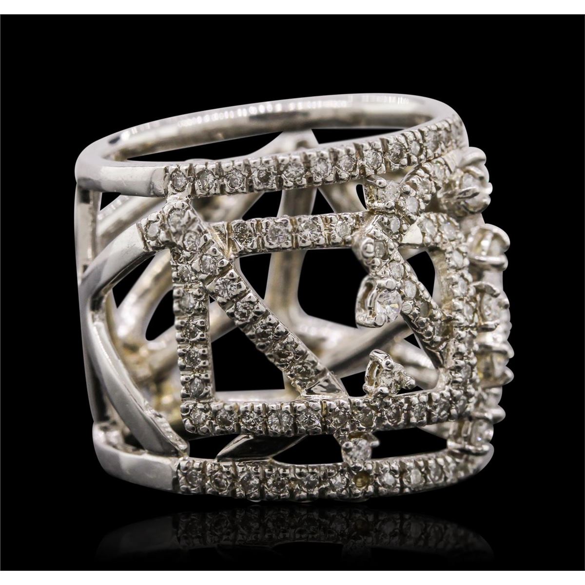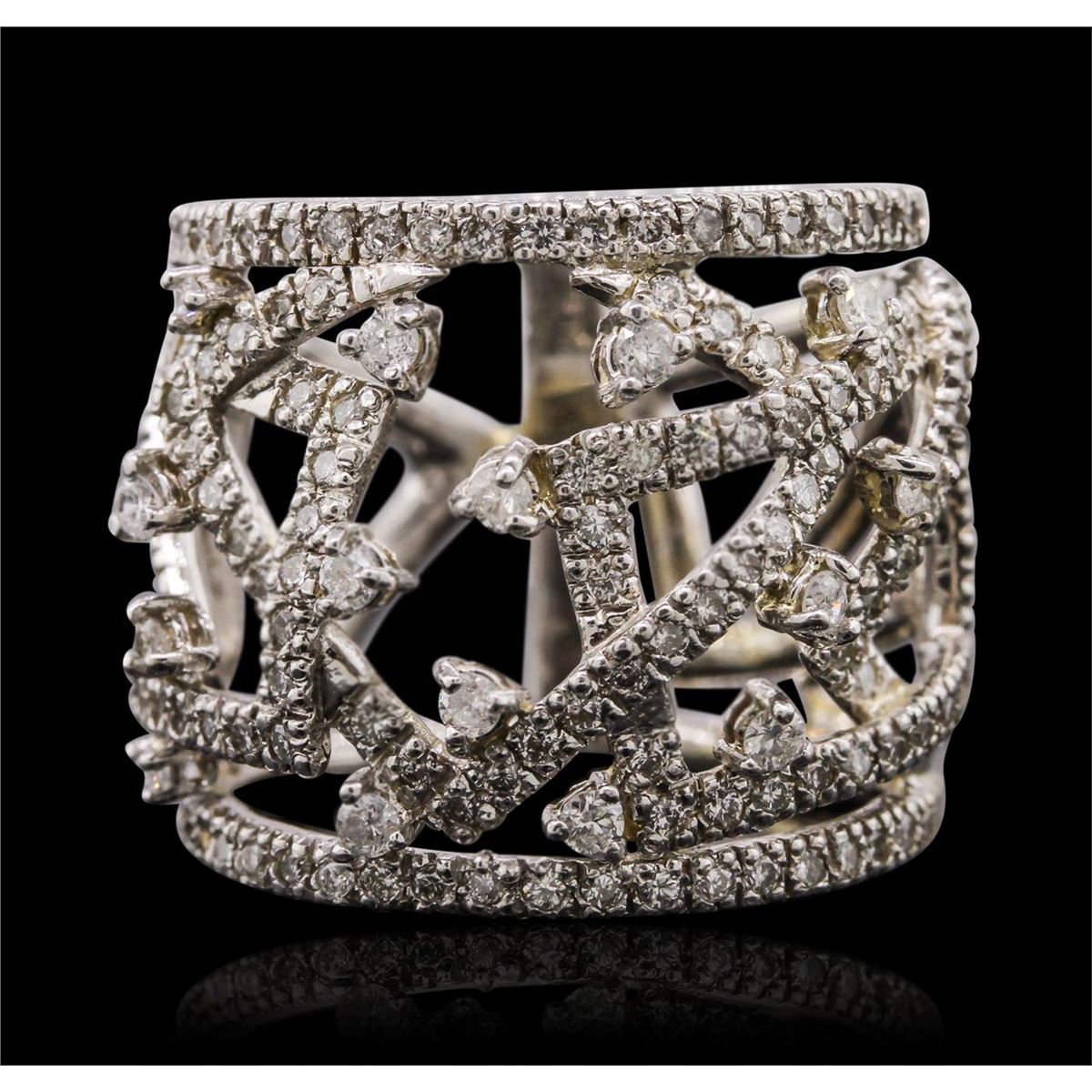 One electronically tested 14KT white gold ladies cast diamond ring with a bright polish finish. Condition is good. The ring features a nineteen millimeter wide intertwining geometric diamond set design, tapering to a seventeen millimeter wide band. Identified with markings of "585". Containing: Fifteen prong set round brilliant cut diamonds, measuring 1.90 - 1.80 x 1.11mm (depth est.) approximate. Total Weight of 15 Stones = 0.45ct. Graded in the setting. Clarity: SI-2 to I-1 . Color: G - I One Hundred Sixty-Eight prong set round brilliant cut diamonds, measuring 1.30 - 1.20 x 0.75mm (depth est.) approximate. Total Weight of 168 Stones = 1.29ct. Graded in the setting. Clarity: SI-1 to I-1 . Color: G - I. Total Weight of Diamonds 1.74ct.. Total Weight of Ring 10.44 grams. AIG Appraised at $7,915.00.